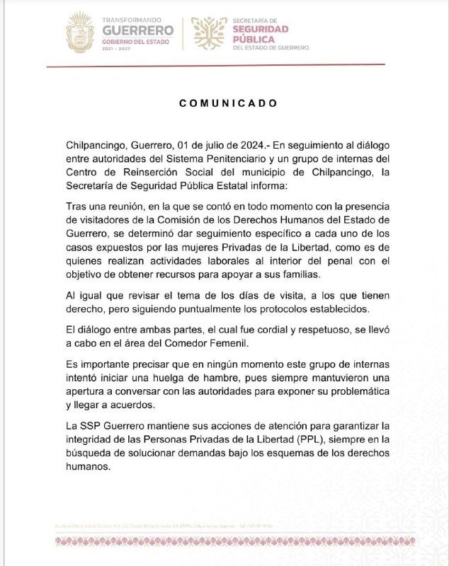 Chilpancingo, Guerrero, 01 de julio de 2024.- En seguimiento al diálogo entre autoridades del Sistema Penitenciario y un grupo de internas del Centro de Reinserción Social del municipio de Chilpancingo, la Secretaría de Seguridad Pública Estatal informa: