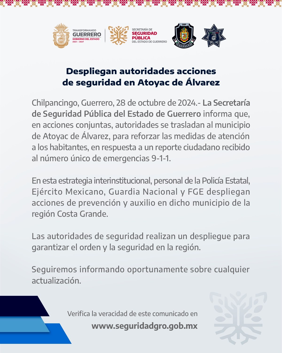 Chilpancingo, Guerrero, 28 de octubre de 2024.- La Secretaría de Seguridad Pública del Estado de Guerrero informa que, en acciones conjuntas, autoridades se trasladan al municipio de Atoyac de Álvarez, para reforzar las medidas de atención a los habitantes, en respuesta a un reporte ciudadano recibido al número único de emergencias 9-1-1.