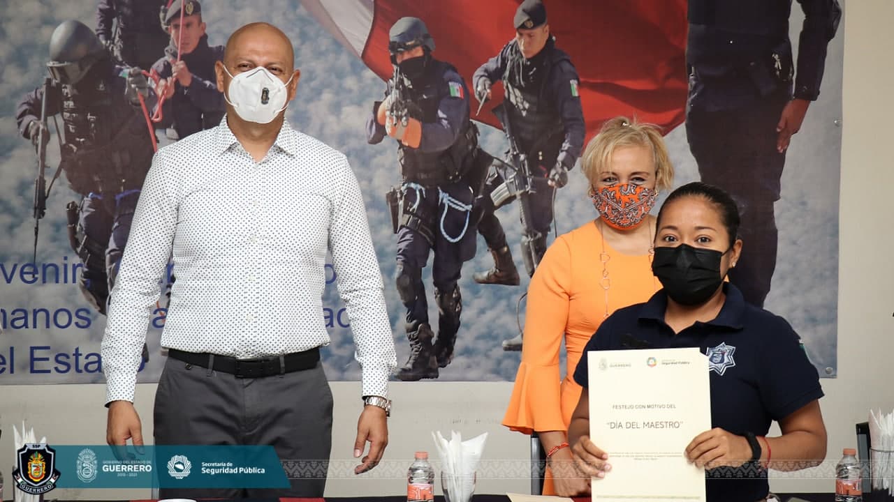 Chilpancingo, Guerrero, 21 de mayo de 2021.- “Ustedes son un verdadero grupo de enseñanza”, expresó el secretario de Seguridad Pública Estatal, David Portillo Menchaca a 18 instructores y 31 docentes de la Universidad Policial (UNIPOL), a quienes este viernes les entregó reconocimientos como parte de la conmemoración del Día del Maestro.