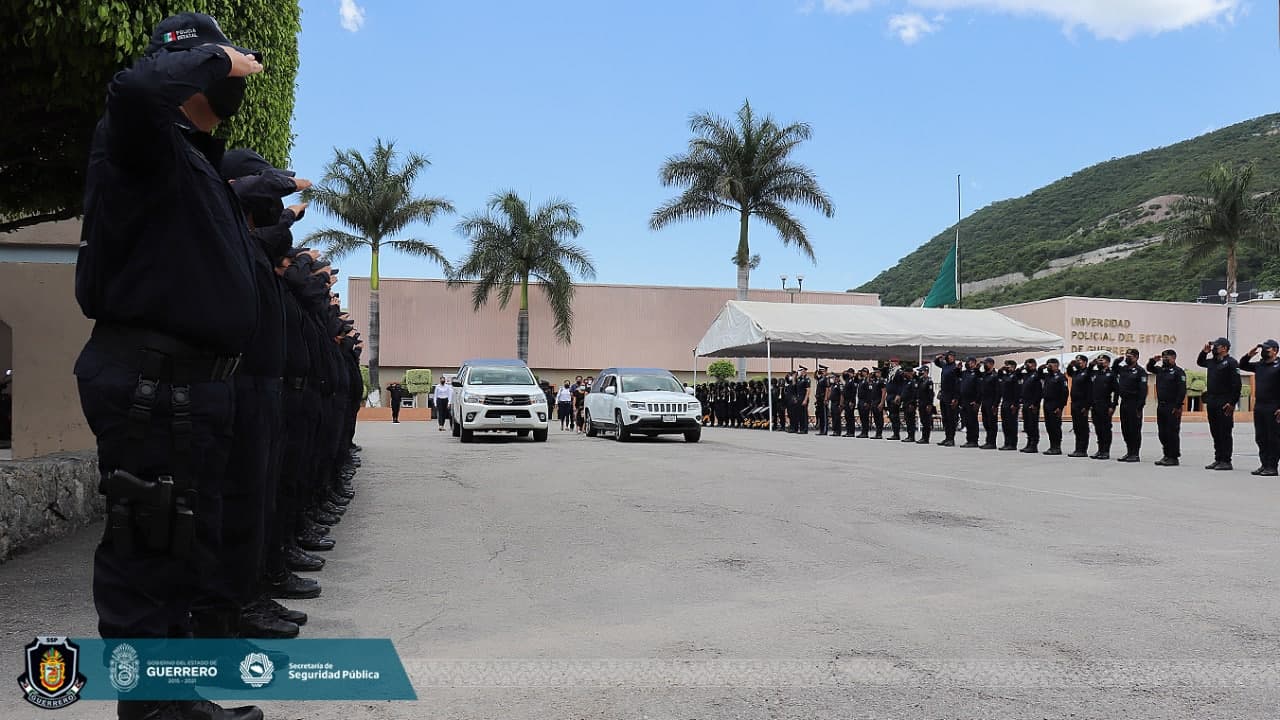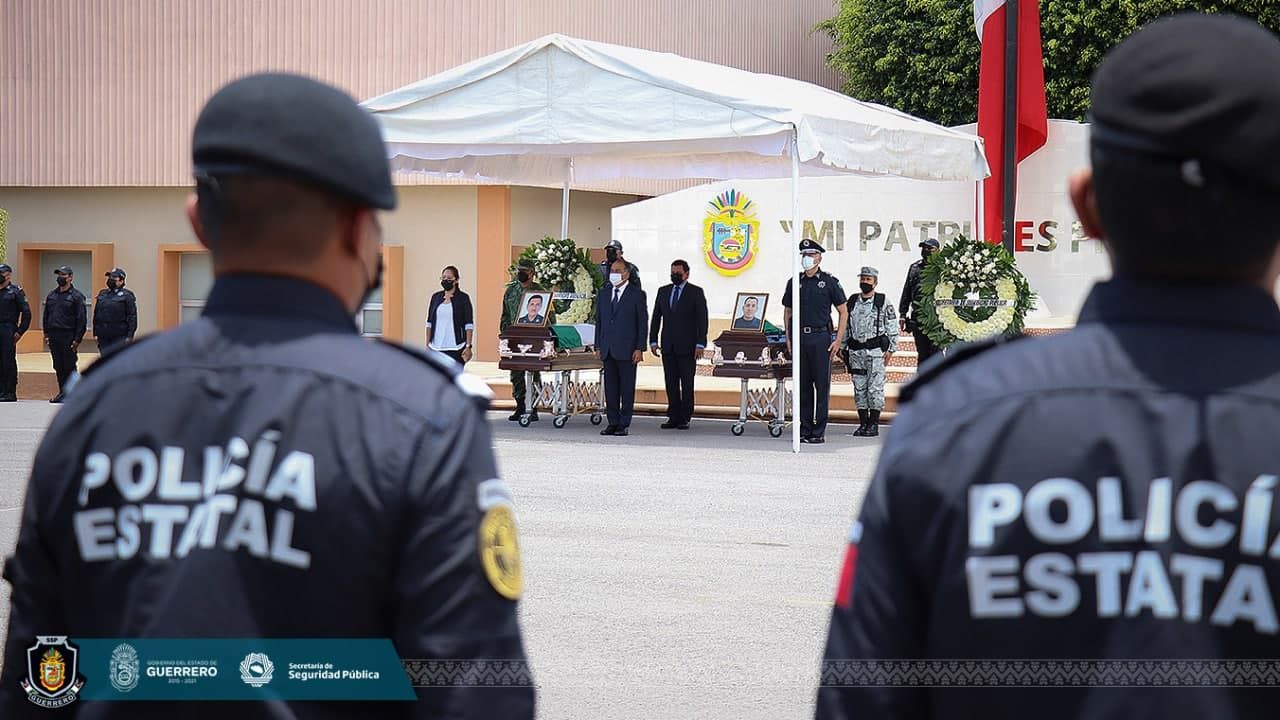 Mandos y elementos de la SSP Guerrero, así como familiares y amigos del Policía Primero, Lamberto Guzmán López y el Policía, Marco Antonio Aldabera Flores se concentraron en la explanada de la Universidad Policial (UNIPOL) donde se desarrolló la ceremonia luctuosa.