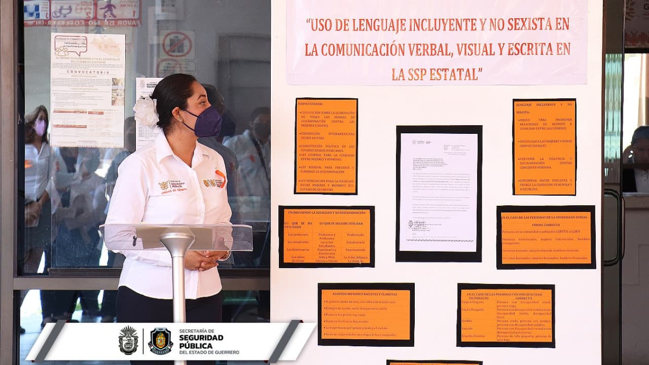 La Unidad de Género de la SSP Guerrero ha entregado a cada una de las áreas una guía sobre lenguaje incluyente y no sexista, además mantiene capacitaciones permanentes dirigidas al personal administrativo y operativo.