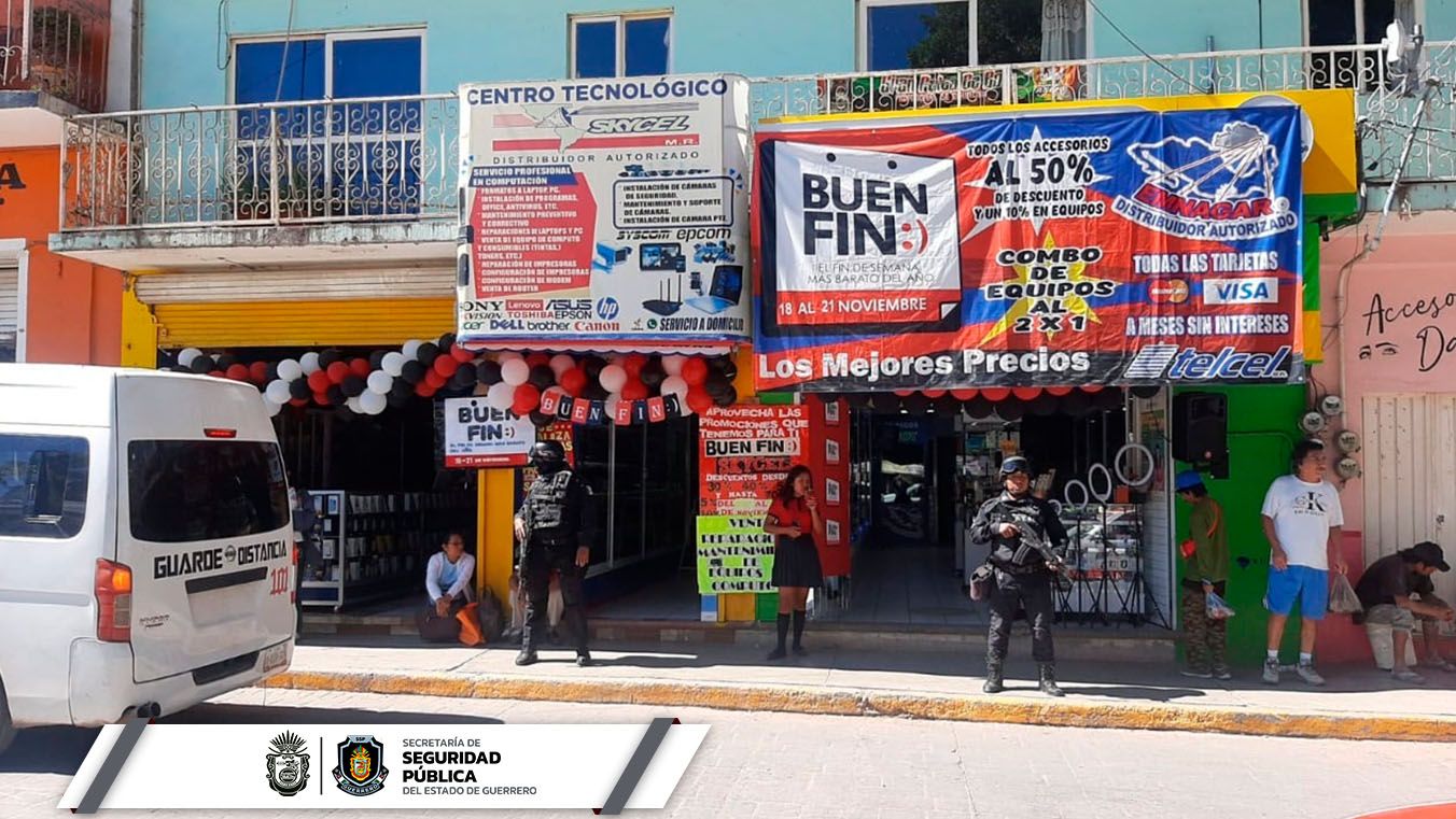 Chilpancingo, Guerrero a 18 de noviembre de 2022.- Con el objetivo de brindar seguridad a la ciudadanía y visitantes, la Secretaría de Seguridad Pública Estatal ha desplegado un dispositivo de seguridad, vigilancia y vialidad en plazas comerciales, tiendas departamentales e instituciones bancarias por el desarrollo del Buen Fin 2022, así como en zonas turísticas por el puente vacacional del 20 de noviembre.