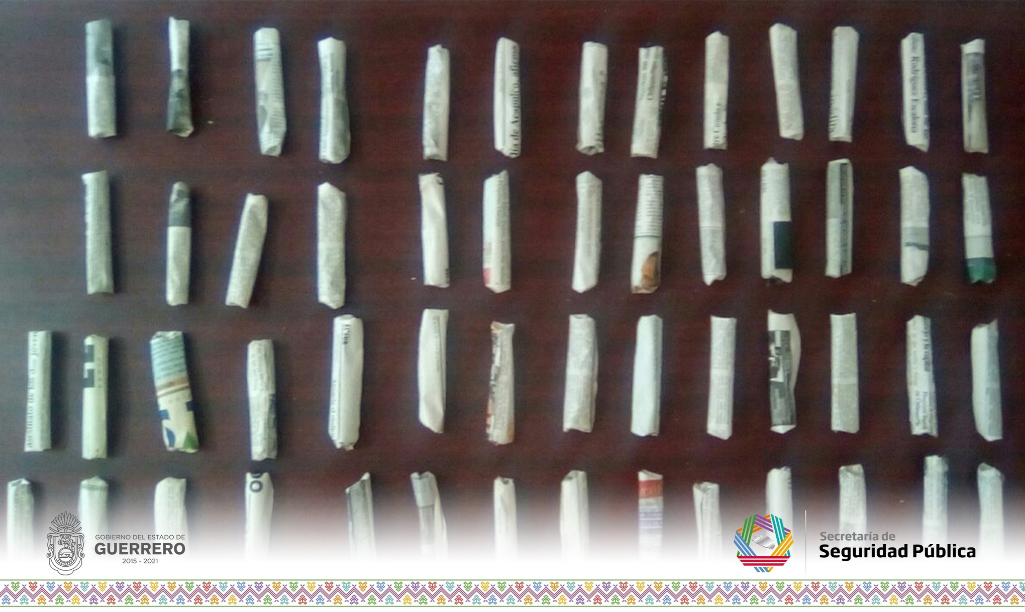 Durante recorridos de prevención del delito en el fraccionamiento Real Hacienda del puerto de Acapulco, los oficiales de la Secretaría de Seguridad Pública del Estado visualizaron a un masculino que al notar la presencia de los uniformados intentó darse a la fuga, por lo que se le marco el alto procediendo a realizarle una revisión a quien dijo llamarse Ángel de Jesús “N” de 22 años de edad, localizando en una bolsa de plástico que traía en la mano, 54 envoltorios de papel periódico que en su interior contenían hierba verde con características propias de la marihuana.