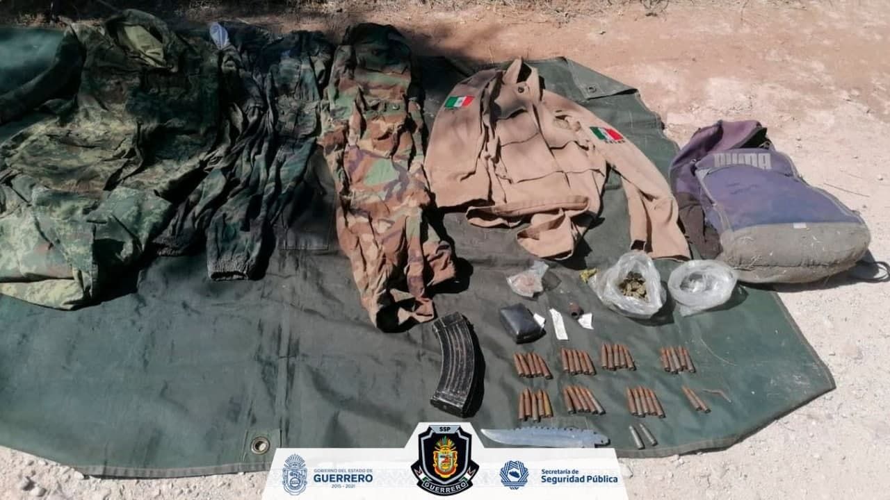 Chilpancingo, Guerrero, 06 de noviembre de 2020.- Como resultado de recorridos de prevención del delito, elementos de la Policía Estatal, en coordinación con el Ejército mexicano, aseguraron equipo táctico, cartuchos, un cargador para fúsil AK-47, una motocicleta y presunta droga en Cutzamala de Pinzón, municipio de la región de la Tierra Caliente.