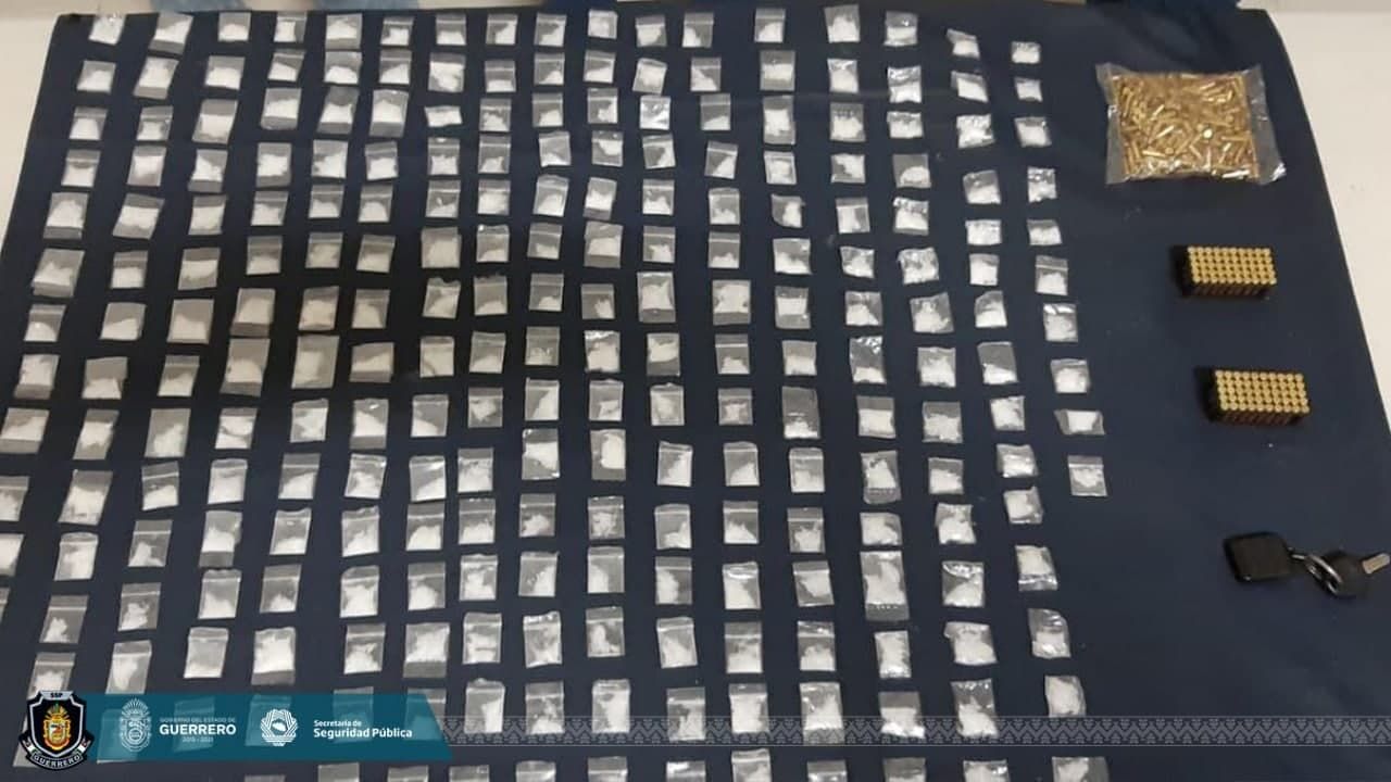 Tras una inspección se les localizaron 200 cartuchos útiles calibres .22 mm y 250 dosis de una sustancia granulada, características similar a la droga conocida como “cristal”.