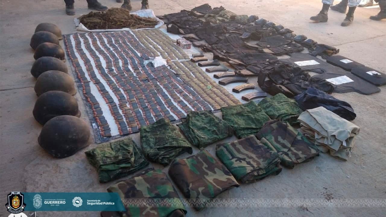 Un costal con hierba seca, color verde, características propias de la marihuana, siete cascos balísticos, 11 chalecos, dos placas balísticas, dos paneles, seis rodilleras, ocho coderas, uniformes pixelados y un par de placas de circulación del estado.