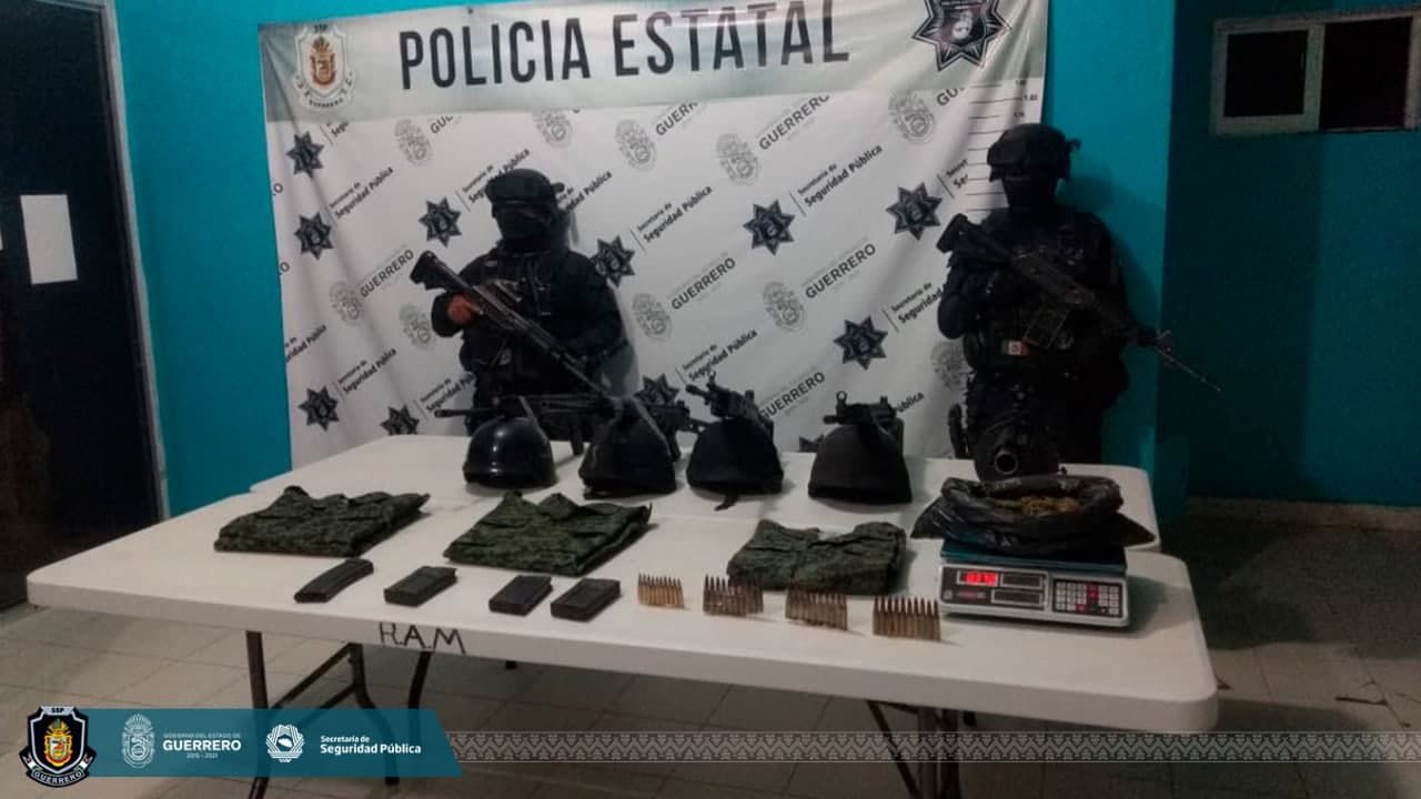 Asegura la Policía Estatal armamento, equipo táctico y presunta droga en el municipio de Coyuca de Catalán