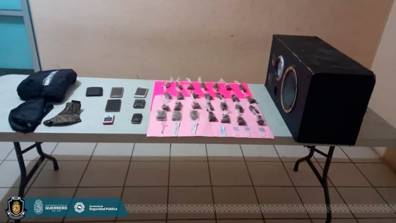 También se ubicaron 25 bolsitas de plástico con hierba verde, similar a la marihuana, en una bocina; así como seis teléfonos celulares de distintas marcas, dos agujas y una mochila.