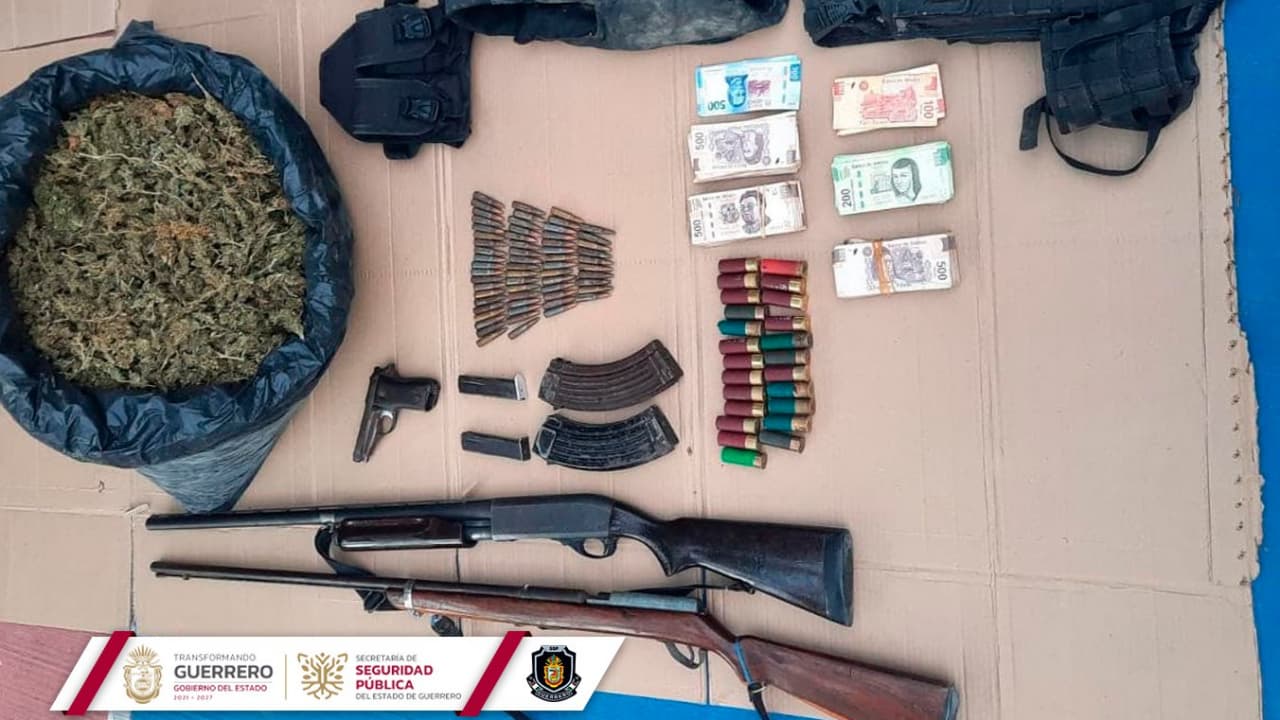 Chilpancingo, Guerrero, 10 de enero de 2022.- Al realizar recorridos de proximidad y seguridad ciudadana, elementos de la Unidad de Fuerzas Especiales de la Policía Estatal lograron asegurar presunta droga, cartuchos, equipo táctico y tres armas de fuego en el municipio de Eduardo Neri.