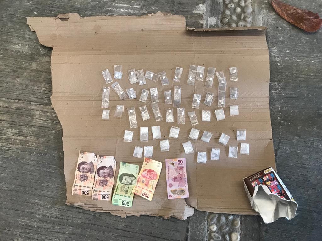 En el interior de la caja, se localizaron 30 bolsitas de plástico transparente con una sustancia sólida, similar a la droga conocida como piedra; 17 bolsitas con sustancia solida con características propias a la droga conocida como cristal.