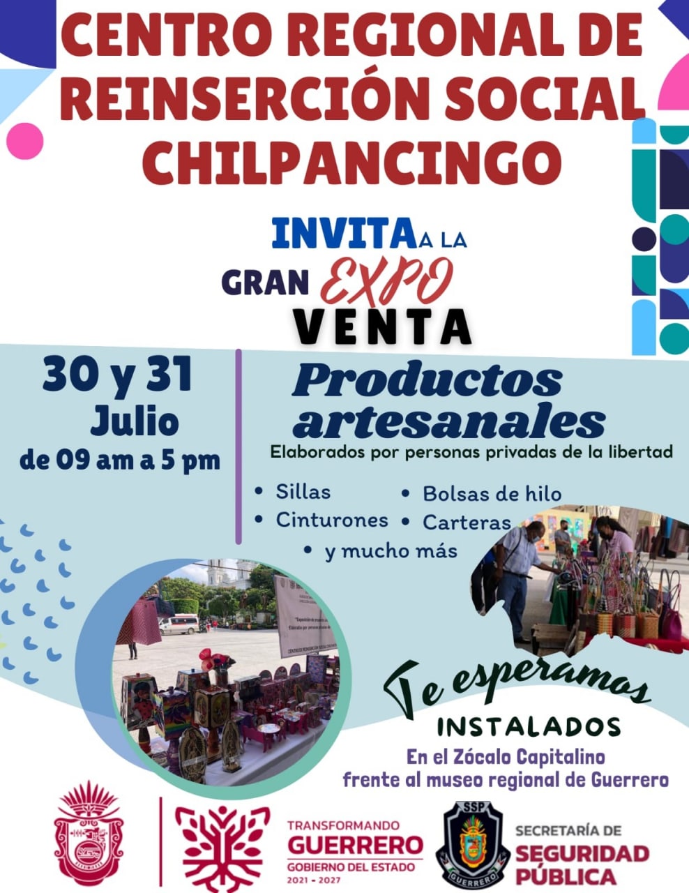 Chilpancingo, Gro., 29 de julio de 2022.- Como parte de los acuerdos del Convenio Intersecretarial del Sistema Penitenciario del Estado suscrito por la Secretaría de Seguridad Pública con los municipios, este sábado y domingo, el Centro Regional de Reinserción Social Chilpancingo con el apoyo del Ayuntamiento se llevará a cabo una EXPO-VENTA de productos artesanales elaborados por las personas privadas de la libertad, como son sillas, sillones, bolsos y bolsas de hilo, cinturones, carteras de plata y pita, entre otro tipo de manualidades.