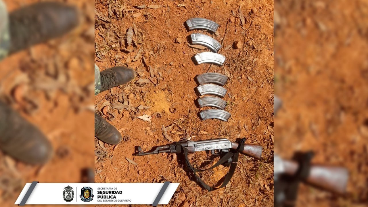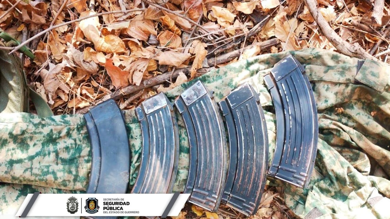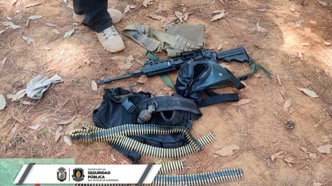 Chilpancingo, Guerrero, 07 de febrero de 2023.- Derivado de la estrategia conjunta y permanente, personal de la Policía Estatal en coordinación con la Secretaría de la Defensa Nacional, Guardia Nacional y Fiscalía General del Estado aseguraron fusiles, cartuchos, una ametralladora, una granada y equipo táctico en el municipio de Petatlán, en la región Costa Grande.