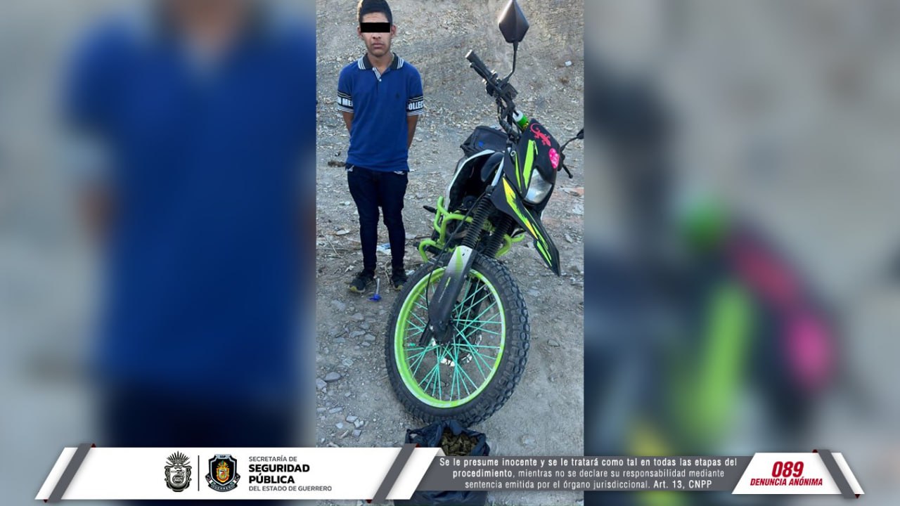 Tras una inspección se le localizó en posesión de una bolsa, en cuyo interior había hierba verde con características de la marihuana. Así como una motocicleta que resultó con reporte de robo.
