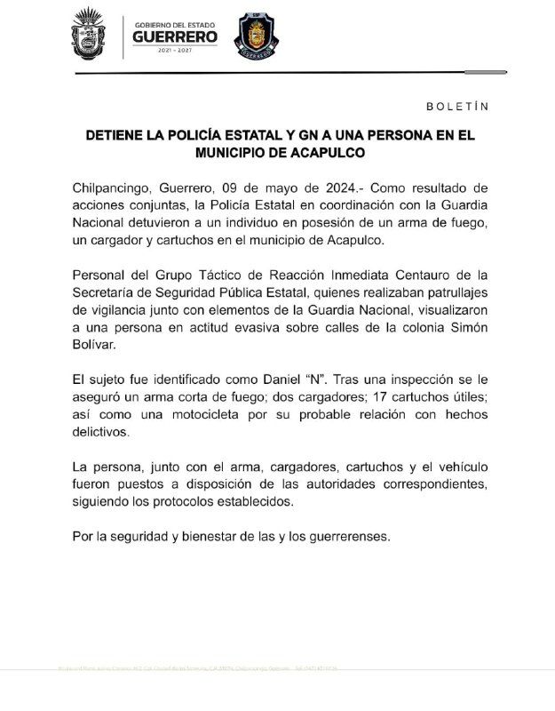 DETIENE LA POLICÍA ESTATAL Y GN A UNA PERSONA EN EL MUNICIPIO DE ACAPULCO