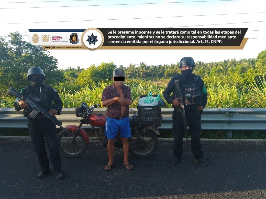 La Unidad de la Policía Ecológica Estatal aseguró una motocicleta en la carretera Zihuatanejo-Acapulco, a la altura de la localidad de Zapotillo, municipio de Coyuca de Benítez.