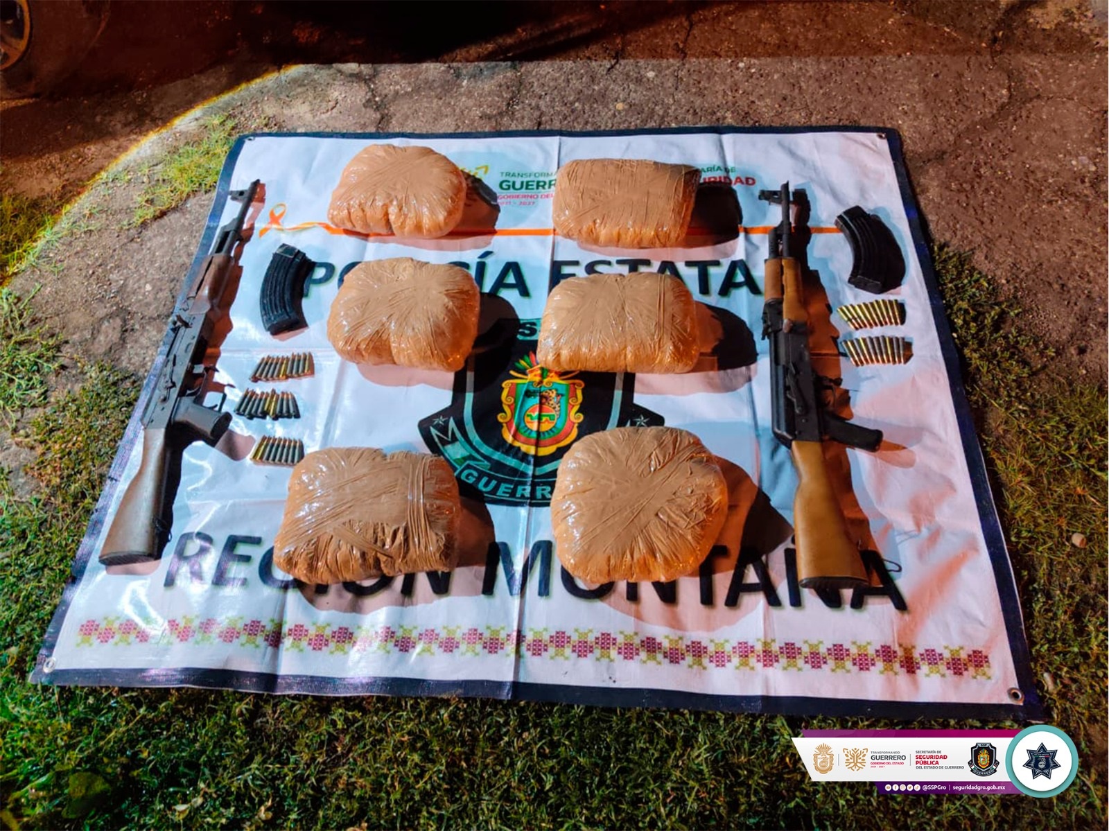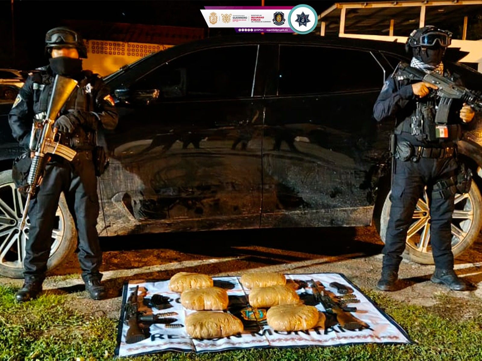 Chilpancingo, Guerrero; 19 de agosto de 2025. La Secretaría de Seguridad Pública del Estado de Guerrero, como parte del fortalecimiento de las acciones de seguridad e inhibición del delito en la Región Montaña, logró el aseguramiento de armamento, presunta droga y un vehículo en el municipio de Tlapa de Comonfort.