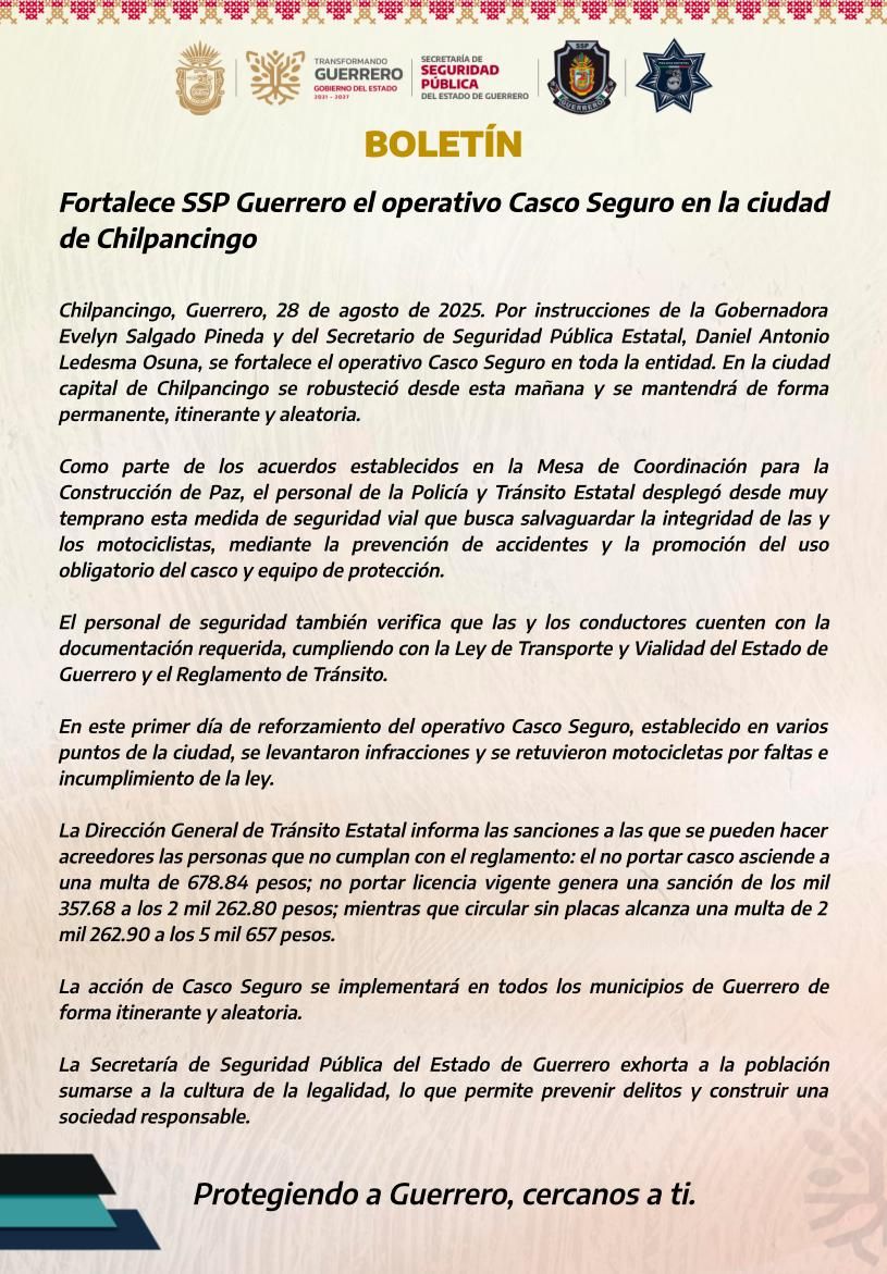 Chilpancingo, Guerrero, 28 de agosto de 2025. Por instrucciones de la gobernadora Evelyn Salgado Pineda y del secretario de Seguridad Pública Estatal, Daniel Antonio Ledesma Osuna, se fortalece el operativo Casco Seguro en toda la entidad. En la ciudad capital de Chilpancingo se robusteció desde esta mañana y se mantendrá de forma permanente, itinerante y aleatoria.
