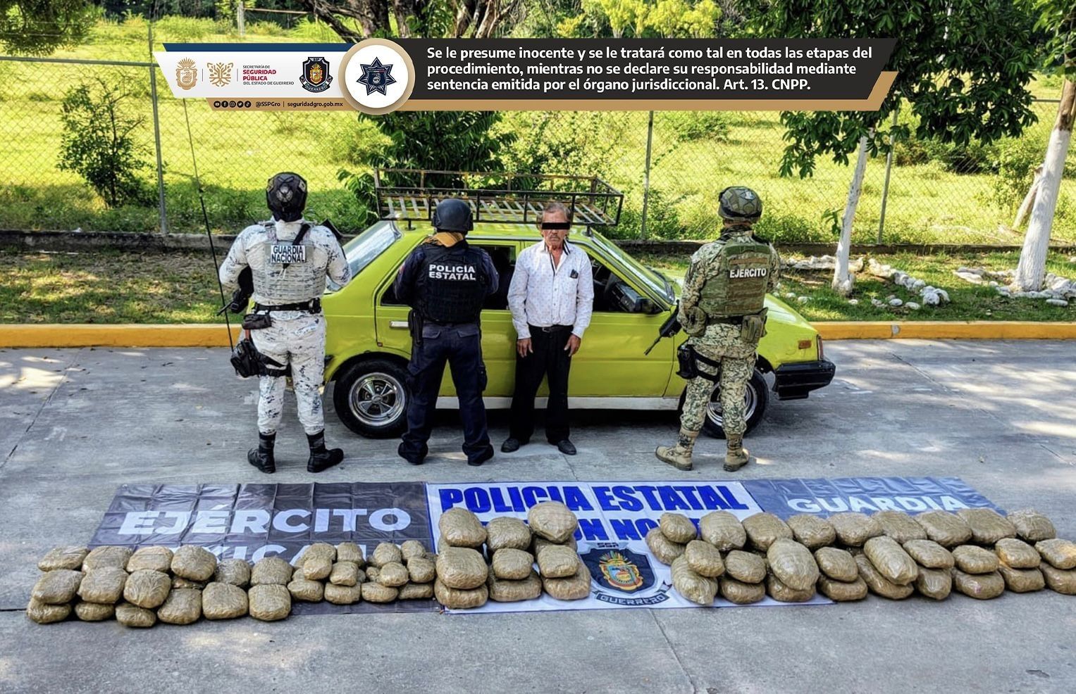 Copalillo, Gro., 3 de noviembre de 2025. Derivado de acciones operativas interinstitucionales entre la Policía Estatal, el Ejército Mexicano y la Guardia Nacional, fue detenido un masculino en posesión de más de 60 kilogramos de presunta marihuana en el municipio de Copalillo.