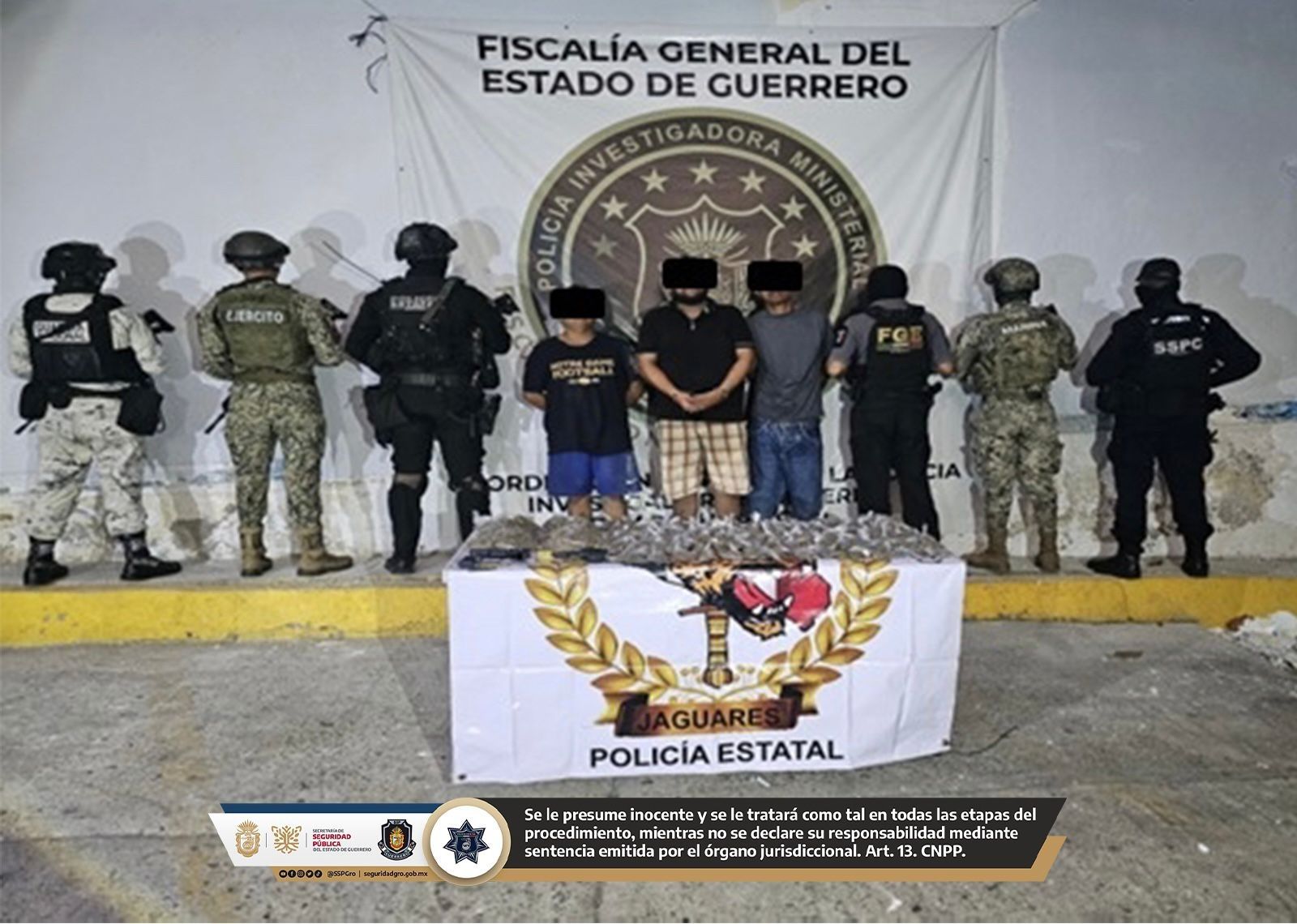 Acapulco, Gro., 3 de noviembre de 2025. Como resultado de acciones operativas interinstitucionales, personal de la Policía Estatal, el Ejército Mexicano, Marina, Guardia Nacional, la Secretaría de Seguridad y Protección Ciudadana y la Fiscalía General del Estado de Guerrero detuvieron a tres masculinos en posesión de armamento, cartuchos y presunta droga en la localidad de Barra de Coyuca, municipio de Coyuca de Benítez.