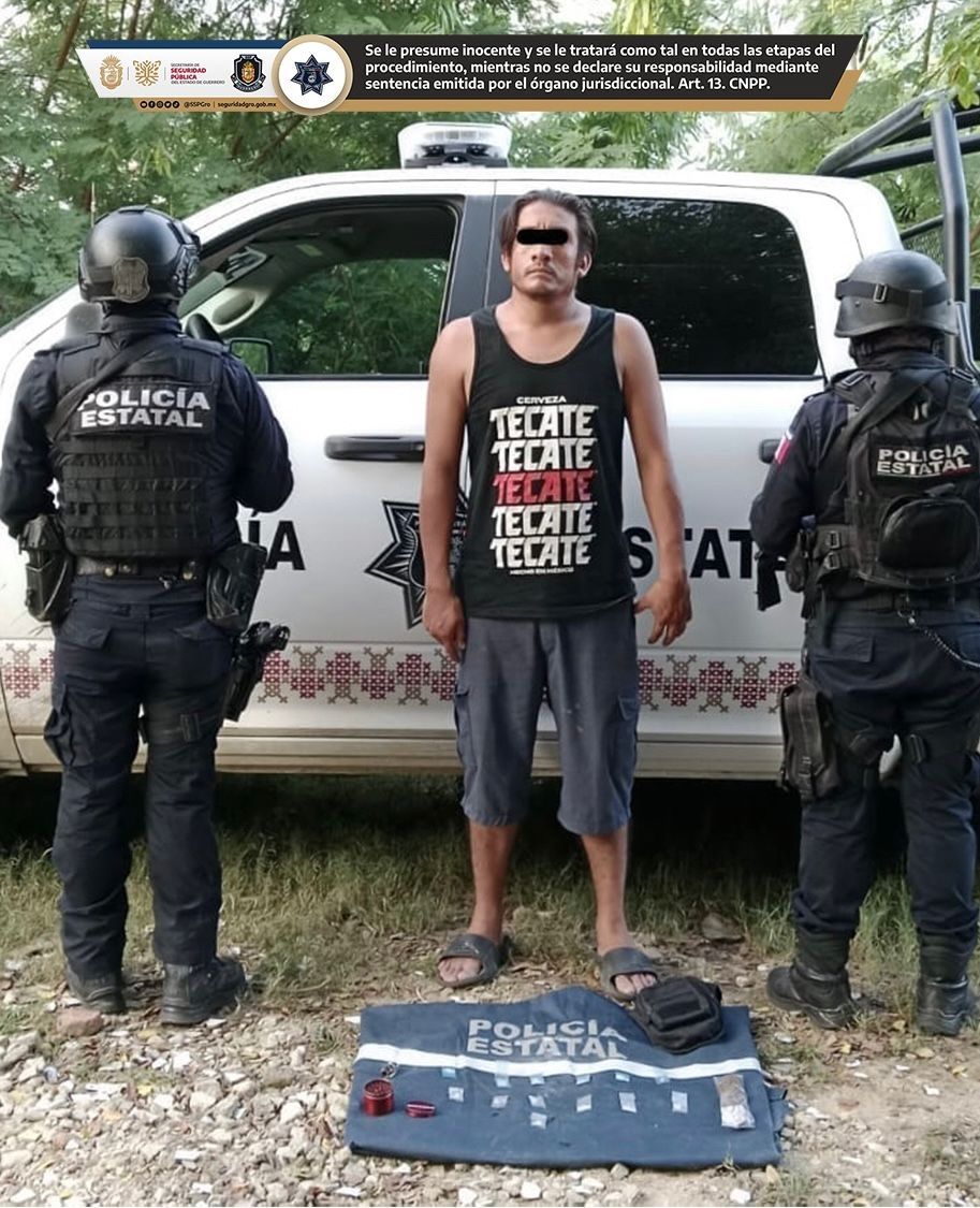 En acciones de seguridad y prevención del delito realizadas por la Policía Estatal en la colonia Jardín Mangos, municipio de Acapulco, fue detenido un hombre en posesión de presunta droga.