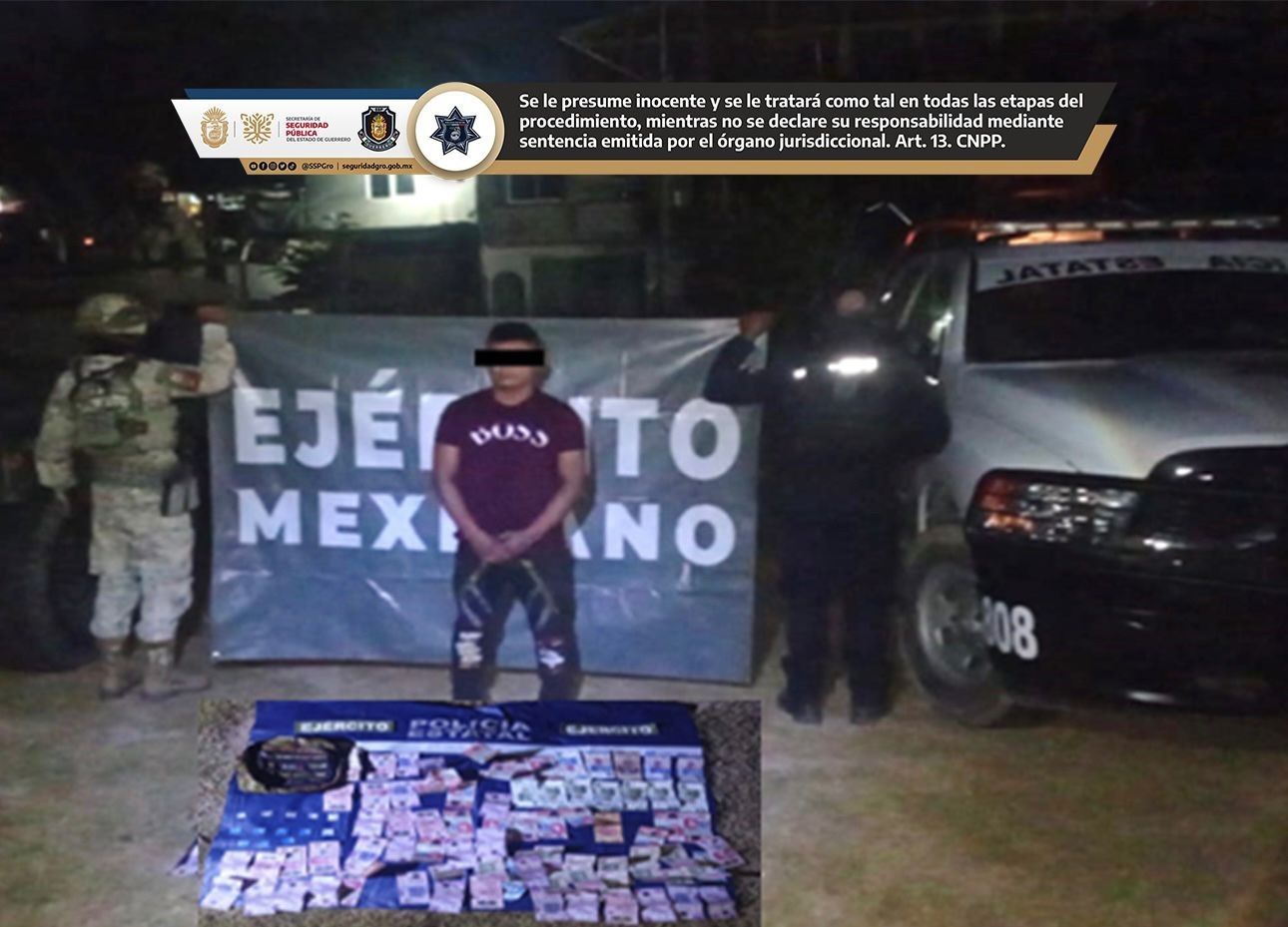 Policía Estatal detuvo a una persona en la localidad de Zacualpan, municipio de Ometepec, se le aseguraron 13 dosis de una sustancia con características propias de la droga conocida como cristal y la cantidad de 8,450 pesos en efectivo.