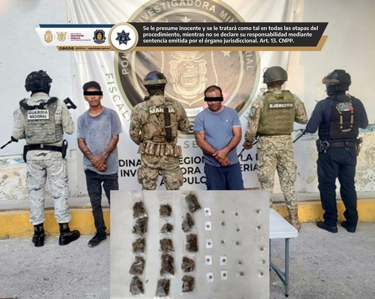 Derivado de los operativos interinstitucionales en los que participan la Policía Estatal, el Ejército Mexicano, la Secretaría de Marina, la Guardia Nacional, la Fiscalía General del Estado y la Secretaría de Seguridad y Protección Ciudadana, fueron detenidas dos personas en la colonia La Poza, municipio de Acapulco.