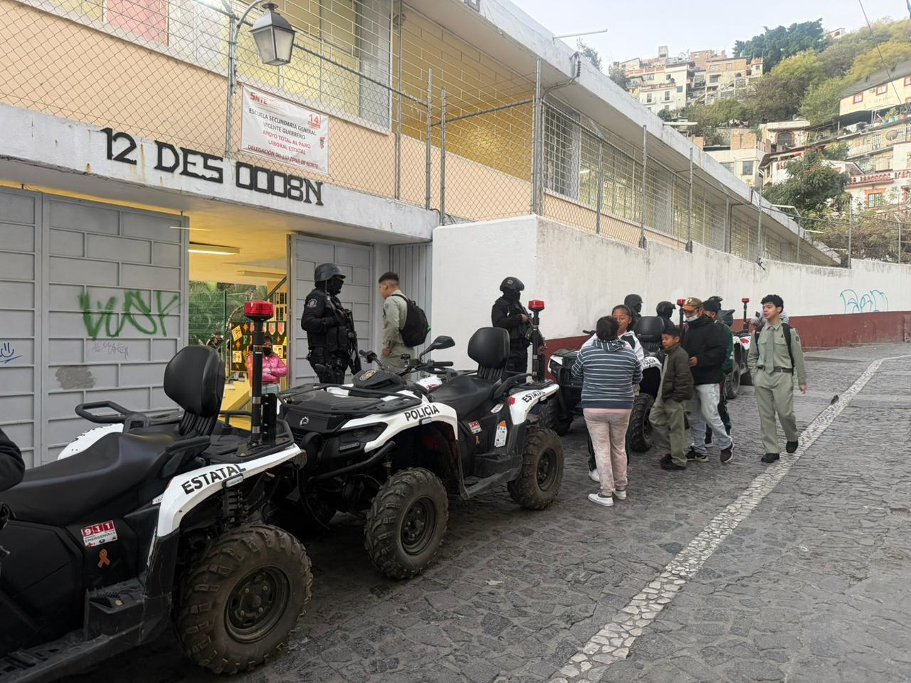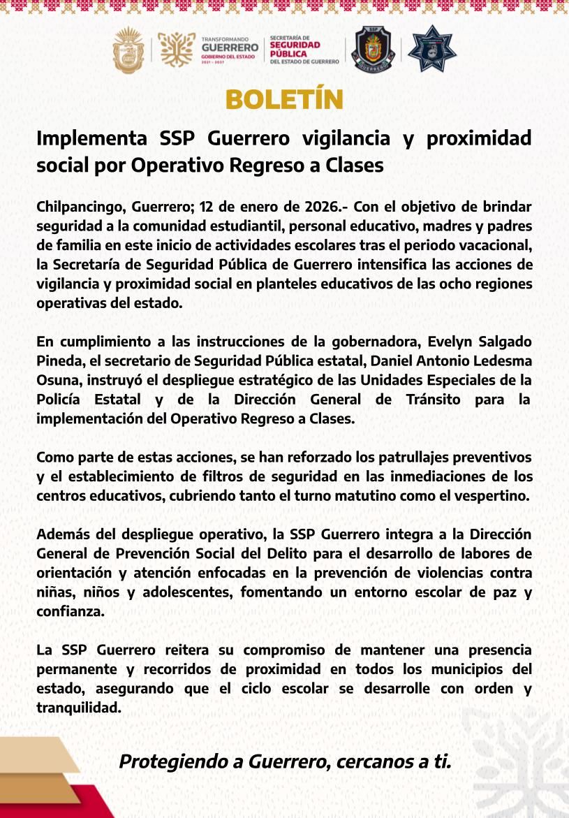 Chilpancingo, Guerrero; 12 de enero de 2026.- Con el objetivo de brindar seguridad a la comunidad estudiantil, personal educativo, madres y padres de familia en este inicio de actividades escolares tras el periodo vacacional, la Secretaría de Seguridad Pública de Guerrero intensifica las acciones de vigilancia y proximidad social en planteles educativos de las ocho regiones operativas del estado.
