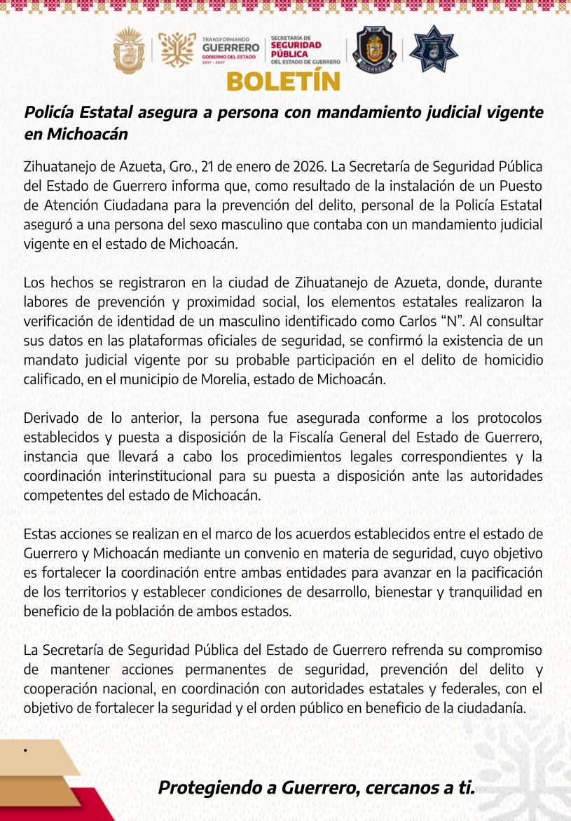 Zihuatanejo de Azueta, Gro., 21 de enero de 2026. La Secretaría de Seguridad Pública del Estado de Guerrero informa que, como resultado de la instalación de un Puesto de Atención Ciudadana para la prevención del delito, personal de la Policía Estatal aseguró a una persona del sexo masculino que contaba con un mandamiento judicial vigente en el estado de Michoacán.