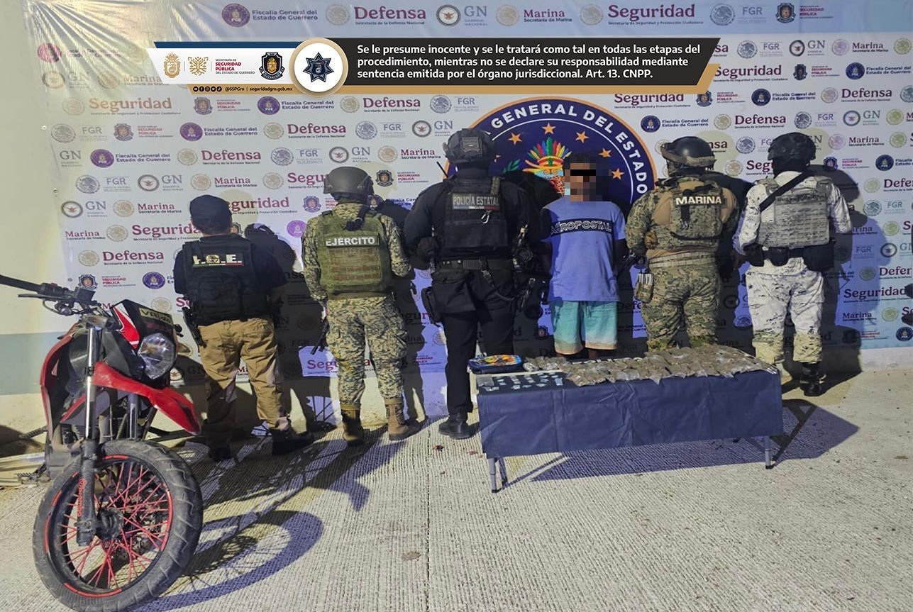 Acapulco, Gro., 20 de febrero de 2026. Un motociclista fue detenido en la localidad de San Pedro Las Playas, en posesión de bolsitas con hierba verde con características propias de la marihuana y diversas dosis con características similares a las drogas conocidas como cristal y “piedra”, así como la motocicleta en la que se desplazaba.