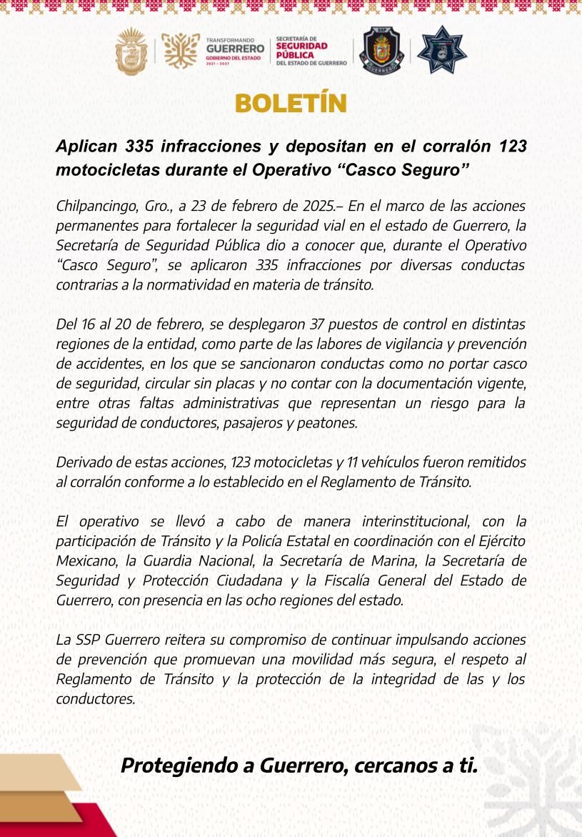 Chilpancingo, Gro., a 23 de febrero de 2025.– En el marco de las acciones permanentes para fortalecer la seguridad vial en el estado de Guerrero, la Secretaría de Seguridad Pública dio a conocer que, durante el Operativo “Casco Seguro”, se aplicaron 335 infracciones por diversas conductas contrarias a la normatividad en materia de tránsito.