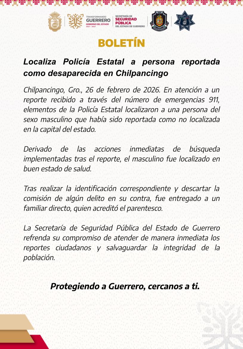 Chilpancingo, Gro., 26 de febrero de 2026. En atención a un reporte recibido a través del número de emergencias 911, elementos de la Policía Estatal localizaron a una persona del sexo masculino que había sido reportada como no localizada en la capital del estado.