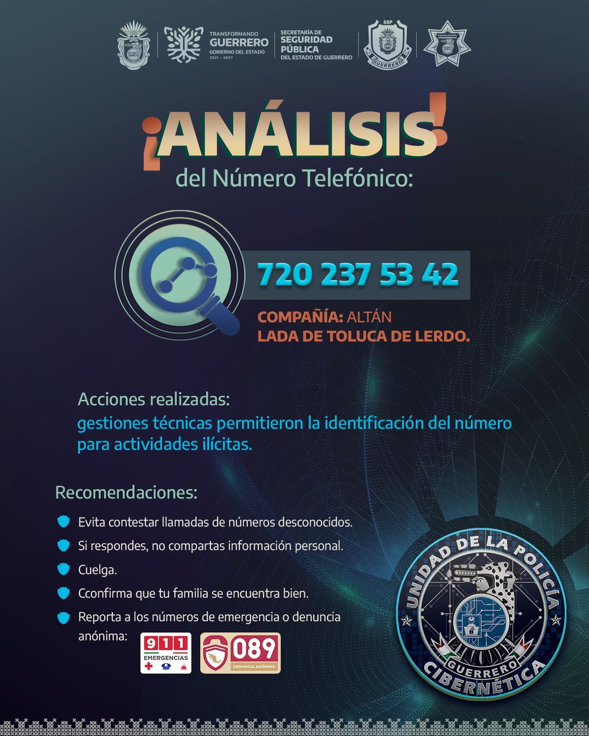 La Secretaría de Seguridad Pública del Estado identificó el número 720 237 53 42 (Compañía: ALTÁN - Lada de Toluca de Lerdo) vinculado a actividades ilícitas.