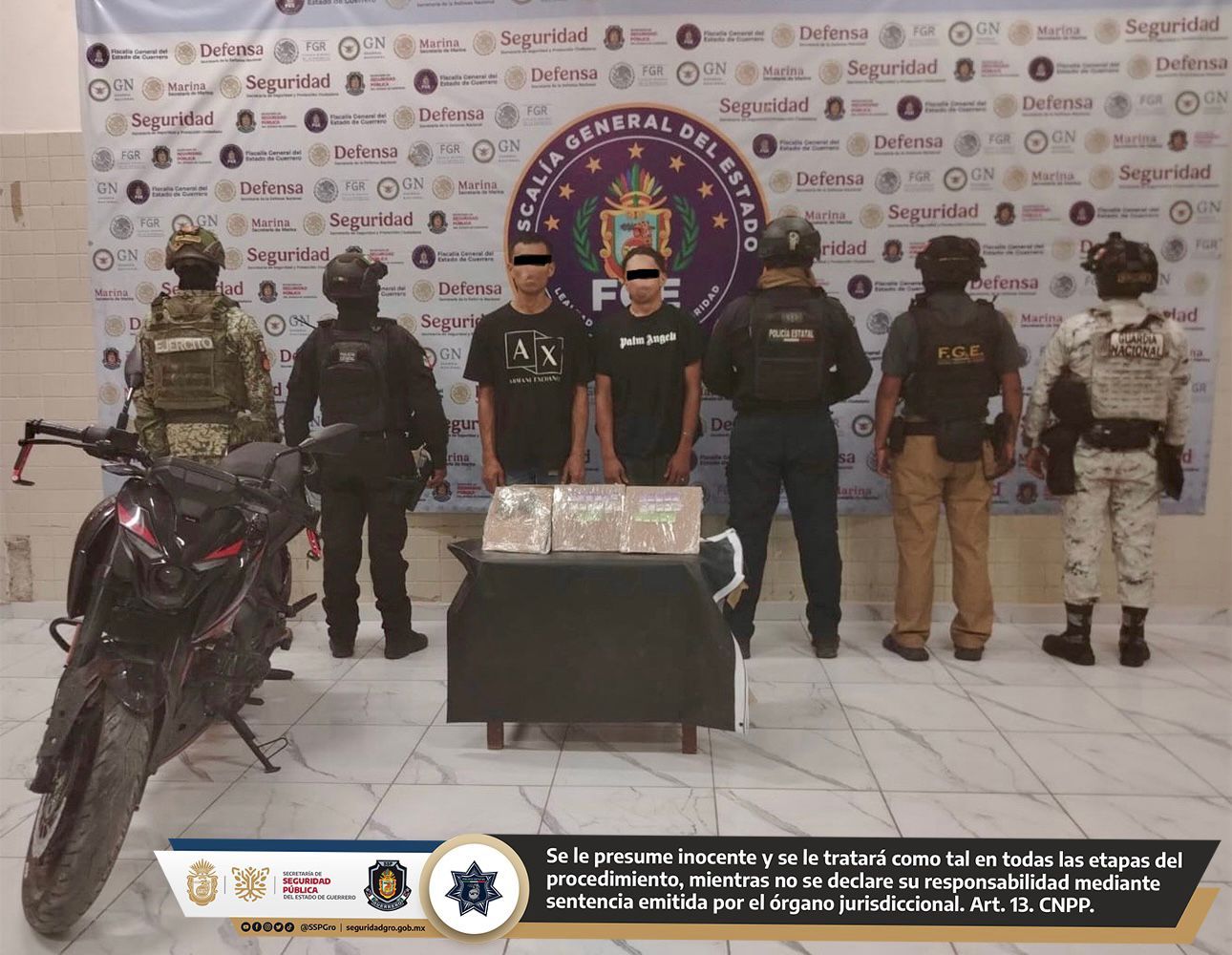 Chilpancingo, Gro., 25 de abril de 2026. La Secretaría de Seguridad Pública del Estado de Guerrero informa que, como resultado de acciones operativas interinstitucionales, elementos de la Policía Estatal, en coordinación con el Ejército Mexicano, la Guardia Nacional y la Fiscalía General del Estado, lograron la detención de dos personas y el aseguramiento de presunta droga en la capital del estado.
