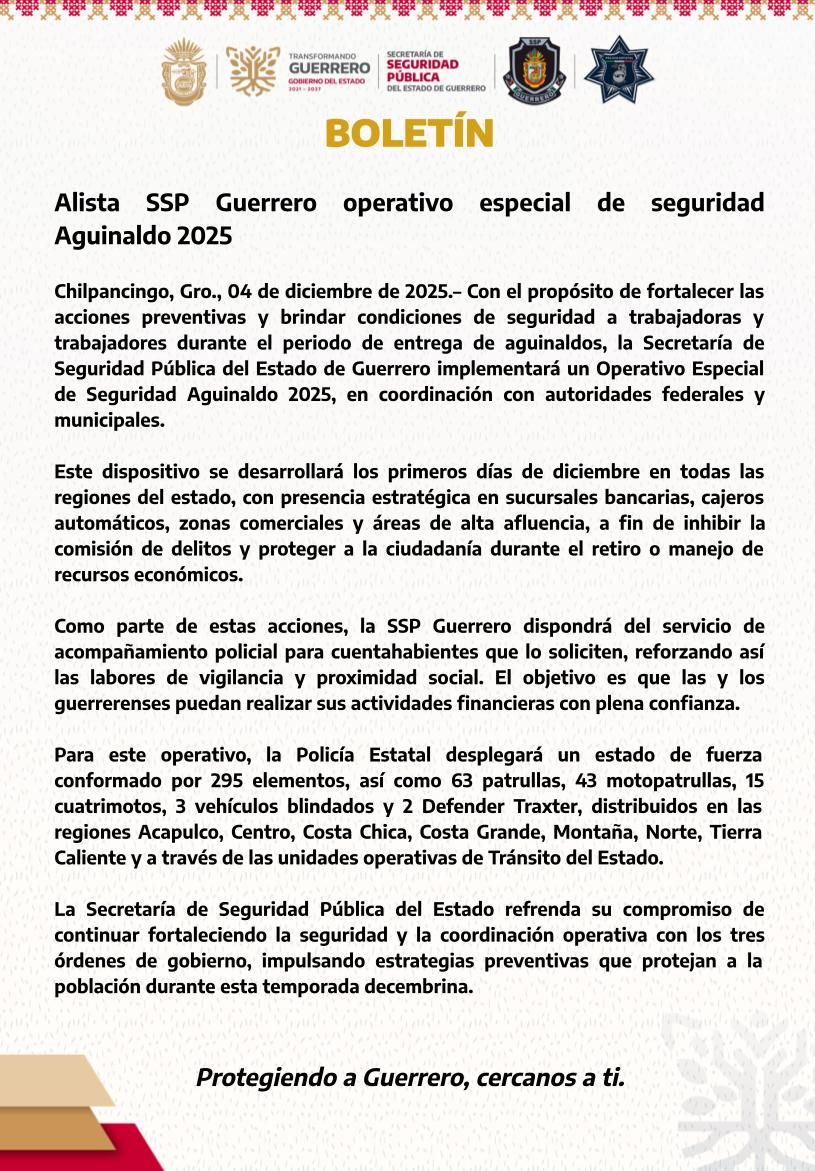 Chilpancingo, Gro., 04 de diciembre de 2025.– Con el propósito de fortalecer las acciones preventivas y brindar condiciones de seguridad a trabajadoras y trabajadores durante el periodo de entrega de aguinaldos, la Secretaría de Seguridad Pública del Estado de Guerrero implementará un Operativo Especial de Seguridad Aguinaldo 2025, en coordinación con autoridades federales y municipales.