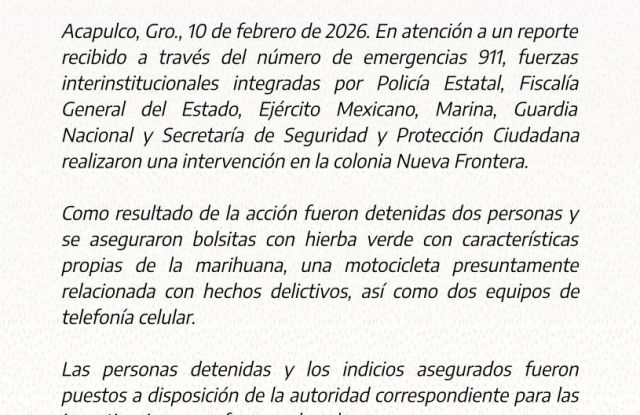 Acapulco, Gro., 9 de febrero de 2026.- Como resultado de acciones interinstitucionales implementadas en el marco del Operativo “Casco Seguro”, elementos de la Policía Estatal, en coordinación con Guardia Nacional, Secretaría de Seguridad y Protección Ciudadana y Policía Municipal, realizaron el aseguramiento de diversas presuntas sustancias ilícitas en la colonia El Parazal, municipio de Acapulco.