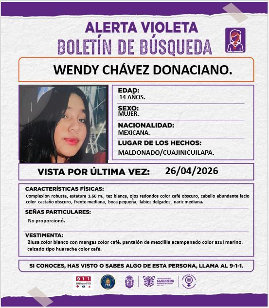 Activamos la #AlertaVioleta por *WENDY CHÁVEZ DONACIANO.* Tu colaboración es fundamental para encontrarla y que regrese con su familia.