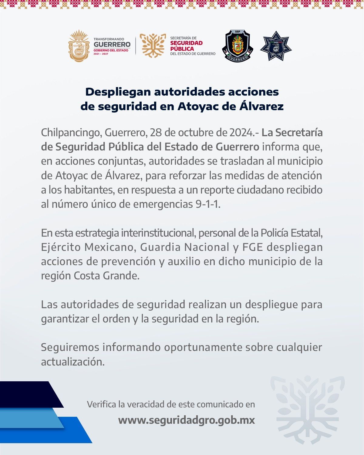 Chilpancingo, Guerrero, 28 de octubre de 2024.- La Secretaría de Seguridad Pública del Estado de Guerrero informa que, en acciones conjuntas, autoridades se trasladan al municipio de Atoyac de Álvarez, para reforzar las medidas de atención a los habitantes, en respuesta a un reporte ciudadano recibido al número único de emergencias 9-1-1.