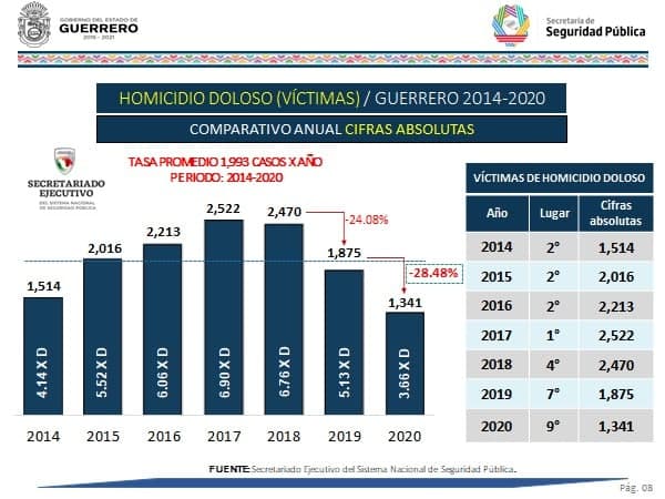 En el caso de los cinco municipios prioritarios –Acapulco, Chilpancingo, Chilapa, Taxco y Zihuatanejo, destacó que existe una disminución en homicidios dolosos del 24.51 por ciento en comparación con el 2019.