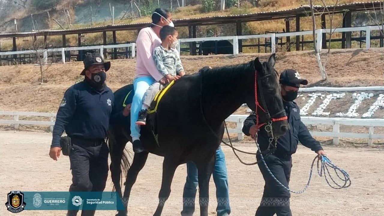 Chilpancingo, Guerrero, 20 de abril del 2021.- Siendo el desarrollo de las niñas y niños una acción prioritaria para el gobierno de Guerrero, por indicaciones del secretario de Seguridad Pública Estatal, David Portillo Menchaca, reinició este martes el Programa de Zooterapias en las instalaciones de la Policía Montada en el municipio de Chilpancingo.