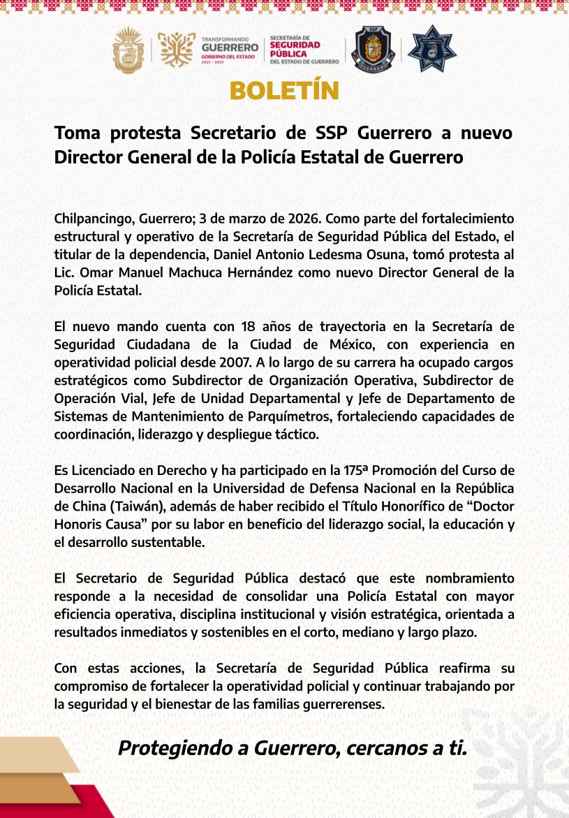 Chilpancingo, Guerrero; 3 de marzo de 2026. Como parte del fortalecimiento estructural y operativo de la Secretaría de Seguridad Pública del Estado, el titular de la dependencia, Daniel Antonio Ledesma Osuna, tomó protesta al Lic. Omar Manuel Machuca Hernández como nuevo Director General de la Policía Estatal.