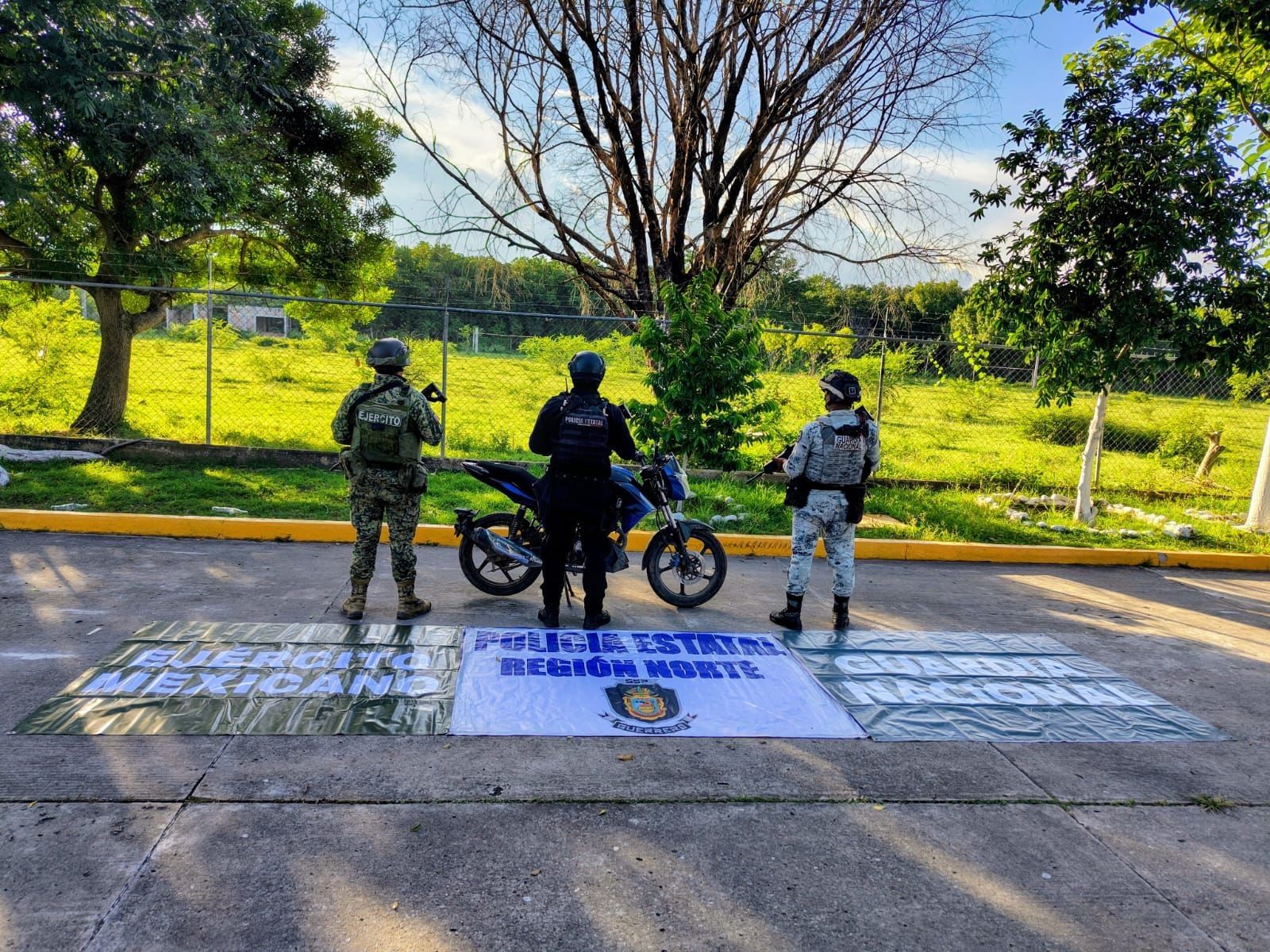 En la localidad de Tuxpan, municipio de Iguala, personal de la Policía Estatal en coordinación con el Ejército Mexicano y la Guardia Nacional, aseguraron una motocicleta con reporte de robo.