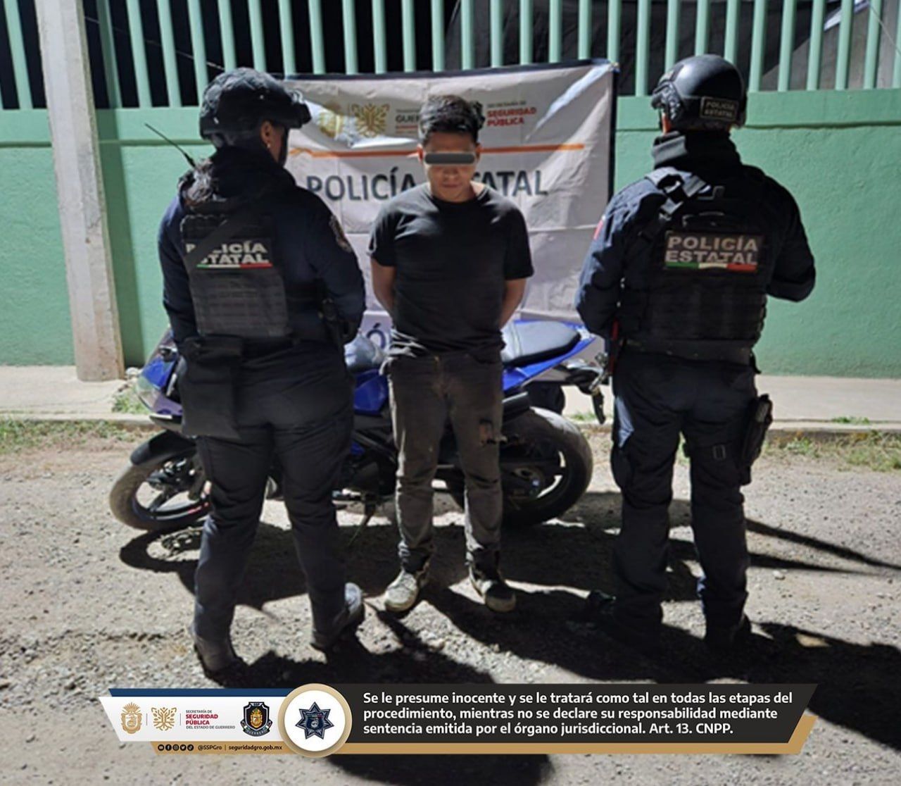 Policía Estatal detuvo a un masculino y recuperó una motocicleta con reporte de robo, en la colonia San José, municipio de Olinalá.