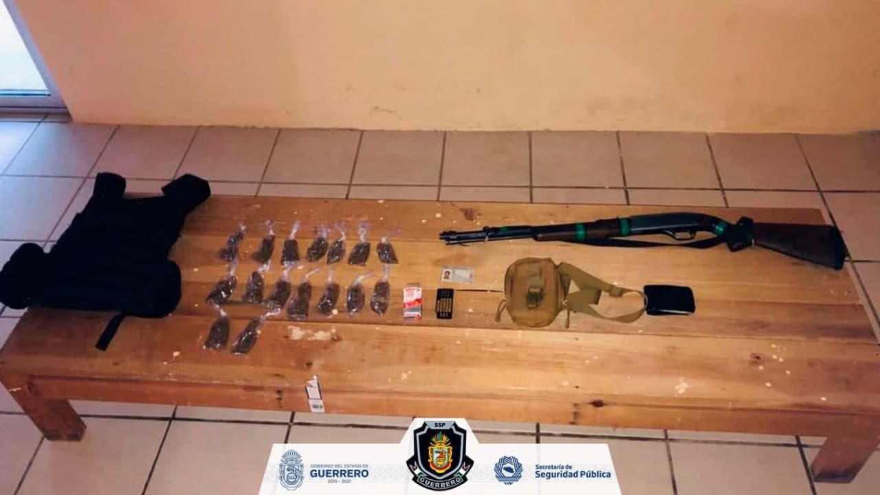 Chilpancingo, Guerrero, 03 de diciembre de 2020.- Como resultado de recorridos de seguridad y prevención, elementos de la Policía Estatal aseguraron a un masculino en posesión de presunta droga, un arma larga de fuego, cartuchos y un chaleco táctico en el municipio de Acapulco de Juárez.
