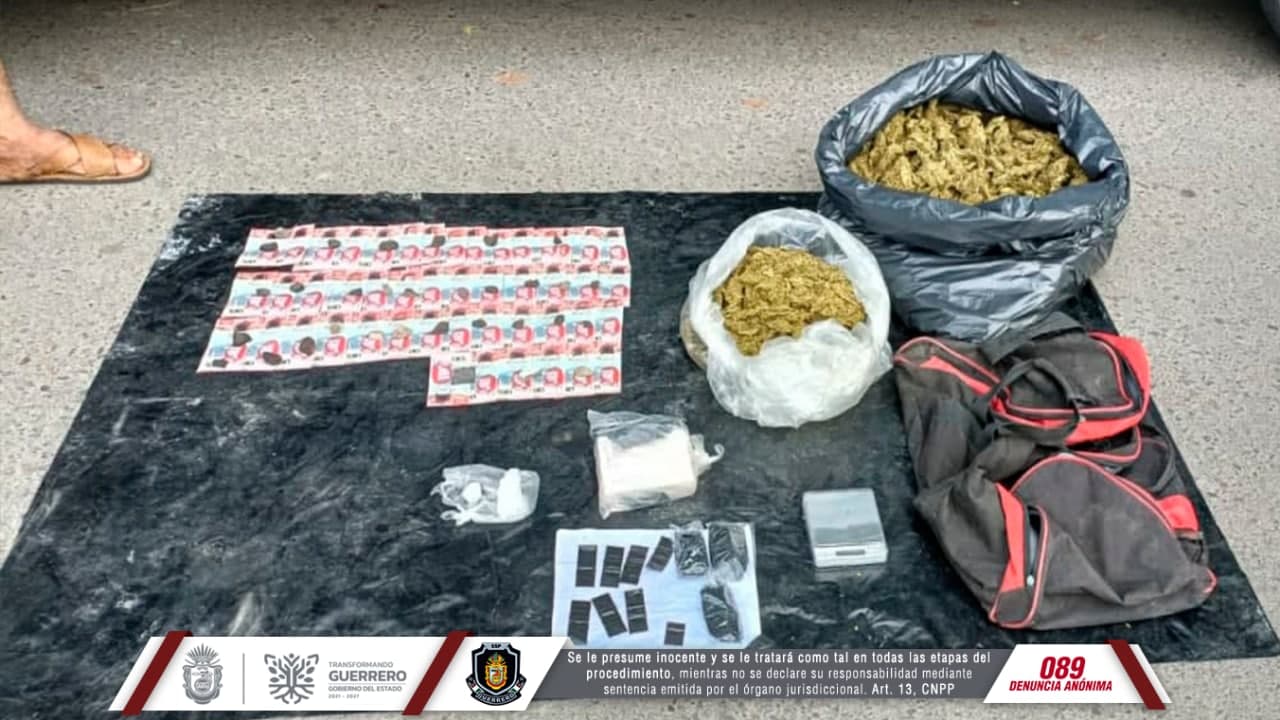 La persona fue identificada como Audel “N”, a quien se le aseguró una mochila en cuyo interior fue localizado lo siguiente: medio kilo de una sustancia blanca, característica de la cocaína, cuatro kilos de hierba seca, similar a la marihuana.