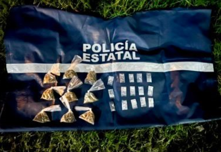 Durante la revisión preventiva, realizada en estricto apego a los protocolos de actuación policial, a la persona detenida le fueron aseguradas 16 dosis de una sustancia con características similares a la droga conocida como cristal, así como 08 bolsitas con probable marihuana.