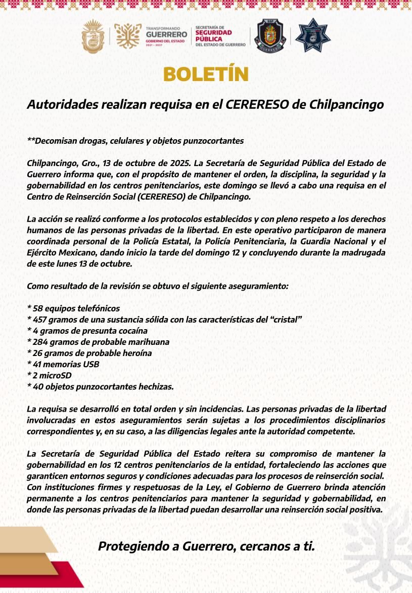 Chilpancingo, Gro., 13 de octubre de 2025. La Secretaría de Seguridad Pública del Estado de Guerrero informa que, con el propósito de mantener el orden, la disciplina, la seguridad y la gobernabilidad en los centros penitenciarios, este domingo se llevó a cabo una requisa en el Centro de Reinserción Social (CERERESO) de Chilpancingo.
