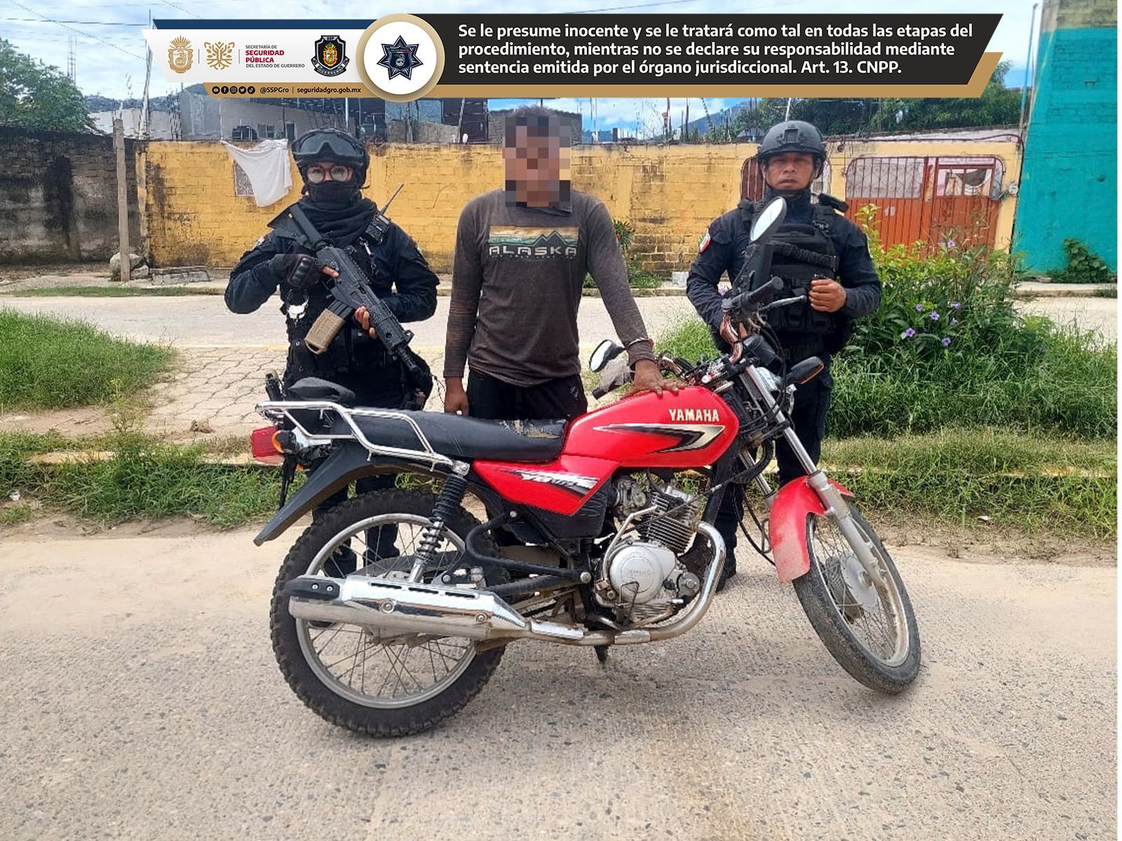 Durante un despliegue operativo enfocado en la prevención y disuasión de delitos en el municipio de Acapulco, personal de la Policía Estatal detuvo a un masculino y aseguró una motocicleta con reporte de robo en la colonia Emiliano Zapata.