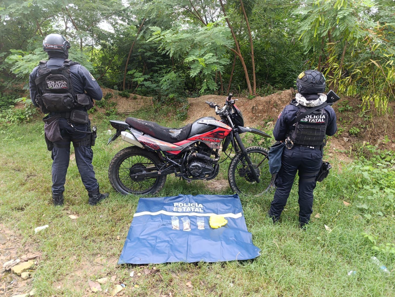 Durante recorridos de seguridad y vigilancia en el poblado de San Pedro Las Playas, municipio de Acapulco, personal de la Policía Estatal ubicó en un paraje una motocicleta que se encontraba tirada y con las luces encendidas.