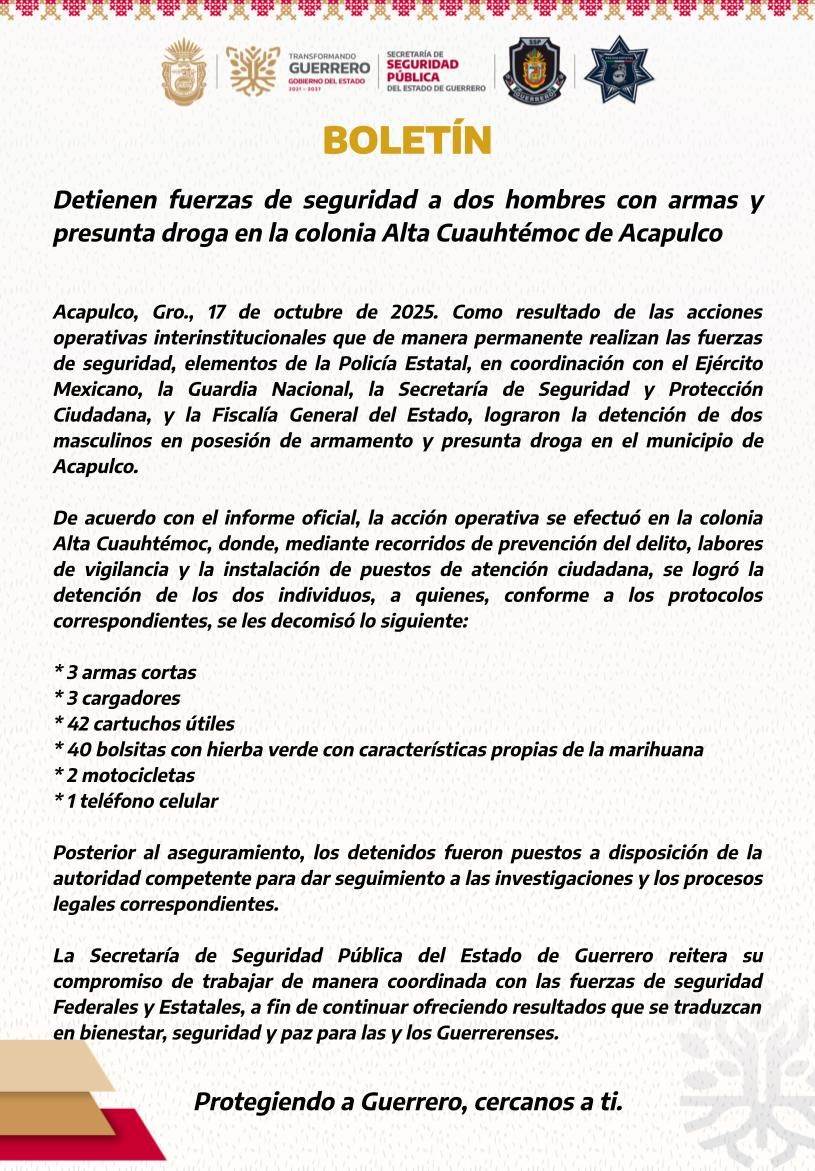 Acapulco, Gro., 17 de octubre de 2025. Como resultado de las acciones operativas interinstitucionales que de manera permanente realizan las fuerzas de seguridad, elementos de la Policía Estatal, en coordinación con el Ejército Mexicano, la Guardia Nacional, la Secretaría de Seguridad y Protección Ciudadana, y la Fiscalía General del Estado, lograron la detención de dos masculinos en posesión de armamento y presunta droga en el municipio de Acapulco.