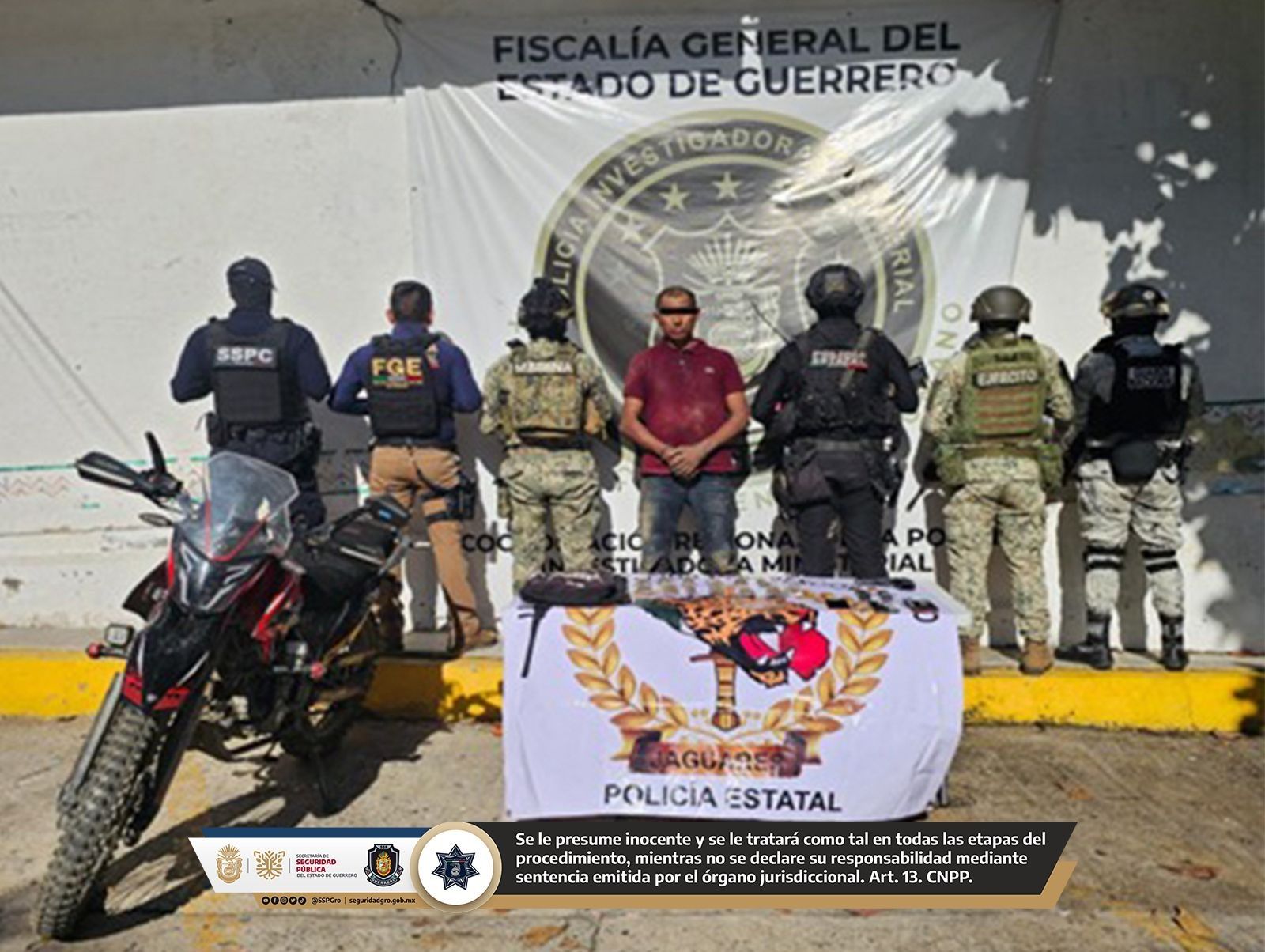 Chilpancingo, Gro., 21 de octubre de 2025. En el marco de las acciones coordinadas de prevención y combate a los delitos en el municipio de Acapulco, la Secretaría de Seguridad Pública del Estado de Guerrero, a través de la Policía Estatal, en coordinación con el Ejército Mexicano, la Guardia Nacional, la Secretaría de Marina, la Secretaría de Seguridad y Protección Ciudadana, y la Fiscalía General del Estado, logró la detención de una persona en posesión de armamento y presunta droga.